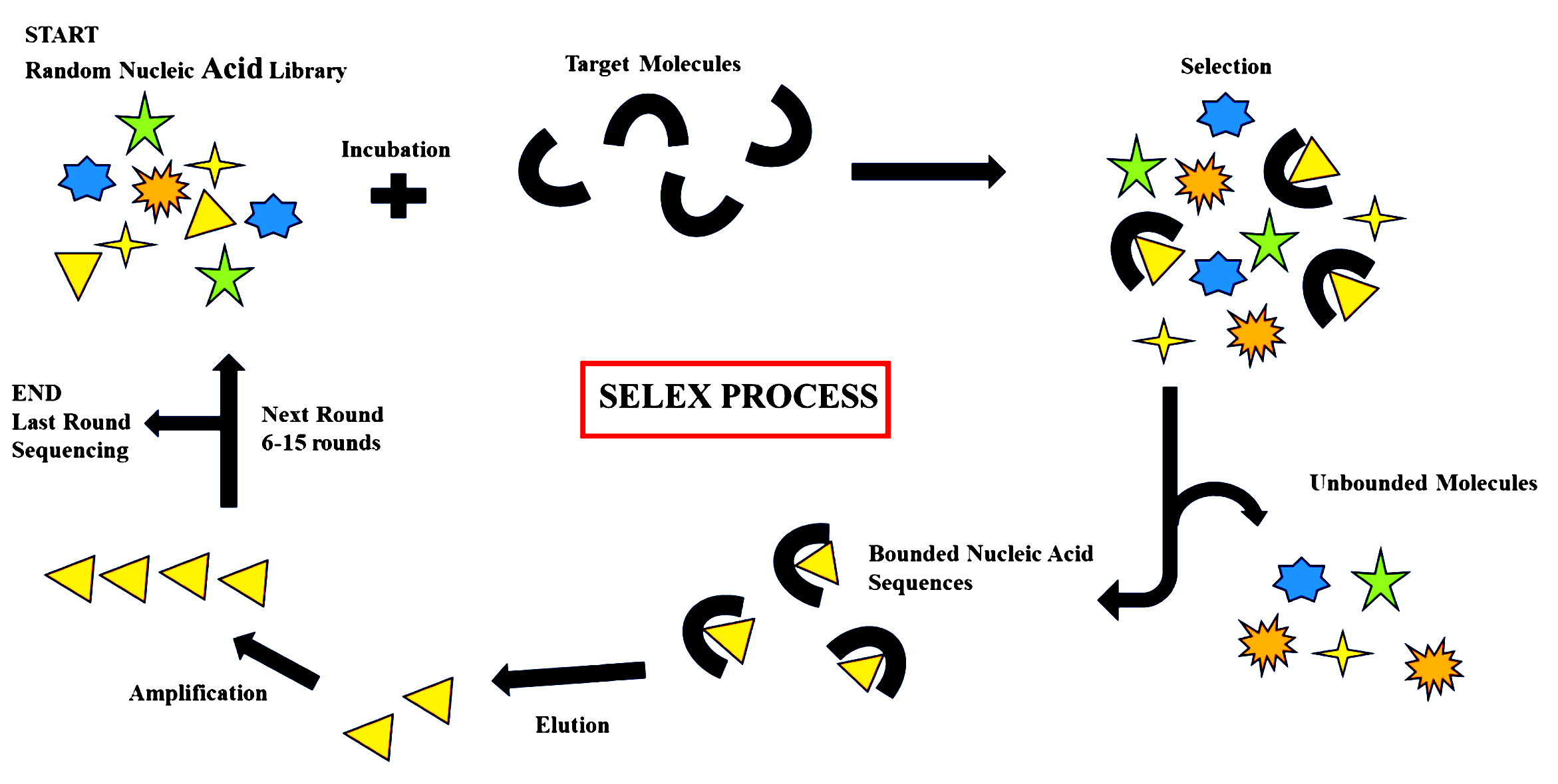 Single-stranded nucleotides of DNA or RNA that target a specific region in proteins, small molecules are known as aptamers, which have a strong affinity towards the target.1 They are artificially produced by a process called SELEX (Systematic Evolution of Ligands by EXponential enrichment), a sequential enrichment method used to isolate highly specific aptamer candidates from a whole set of aptamer sequences.2 In recent years, applications against complex targets, like microbial pathogens, have been diagnosed with multiple complex SELEX variants, notably cell-SELEX, microfluidic-SELEX, and toggle-SELEX, which drastically improved the efficacy and specificity of aptamer selection.3,4