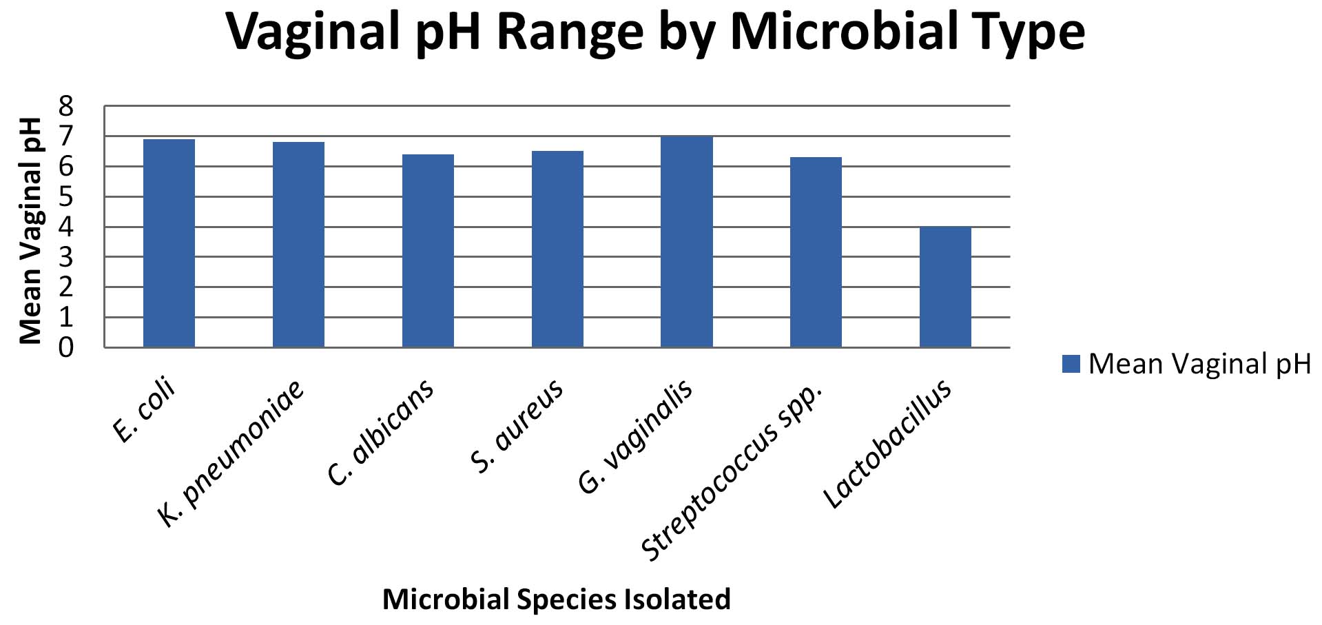 Figure. Vaginal pH Range by Microbial Type. Bar chart showing means pH values for each microbial group. Higher pH values are observed in samples with E. coli, Klebsiella pneumoniae, and Gardnerella vaginalis, whereas Lactobacillus-dominated samples show consistently lower pH
