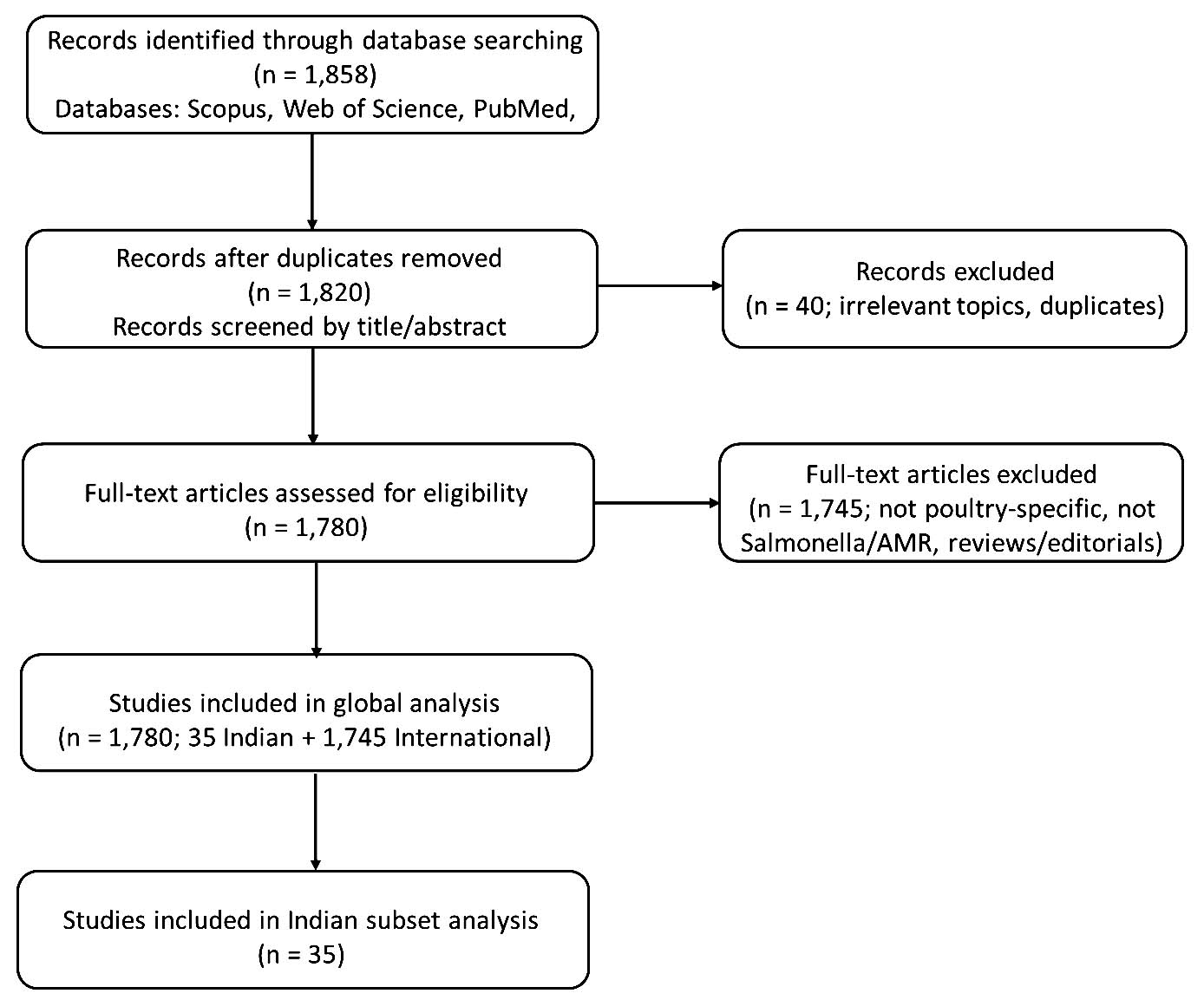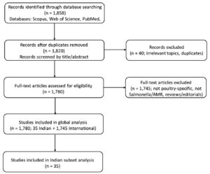 A comprehensive literature search was conducted to gather relevant data on the prevalence and AMR patterns of Salmonella in poultry across India and globally. Scholarly articles were retrieved from search engines Scopus, Google Scholar, and PubMed using primary keywords such as Salmonella, prevalence, poultry, India, broiler chicken, and eggs. The search covered studies published between January 2000 and March 2025, with the final search completed on March 31, 2025. In total, 1,858 records were identified. After removal of 38 duplicates and 40 irrelevant studies, 1,780 peer-reviewed original research articles were retained for analysis. Of these, 35 studies were conducted in India, which were analyzed separately to compare India-specific findings with global trends. To ensure quality, only peer-reviewed original research published in English was included. Eligible studies had to report either (i) prevalence of Salmonella in poultry or poultry products, (ii) AMR patterns in Salmonella isolates, or (iii) data relevant to bibliometric comparisons. Exclusion criteria were: studies not focused on poultry or Salmonella, reviews, editorials, conference abstracts, theses, and articles without original laboratory or field data.
