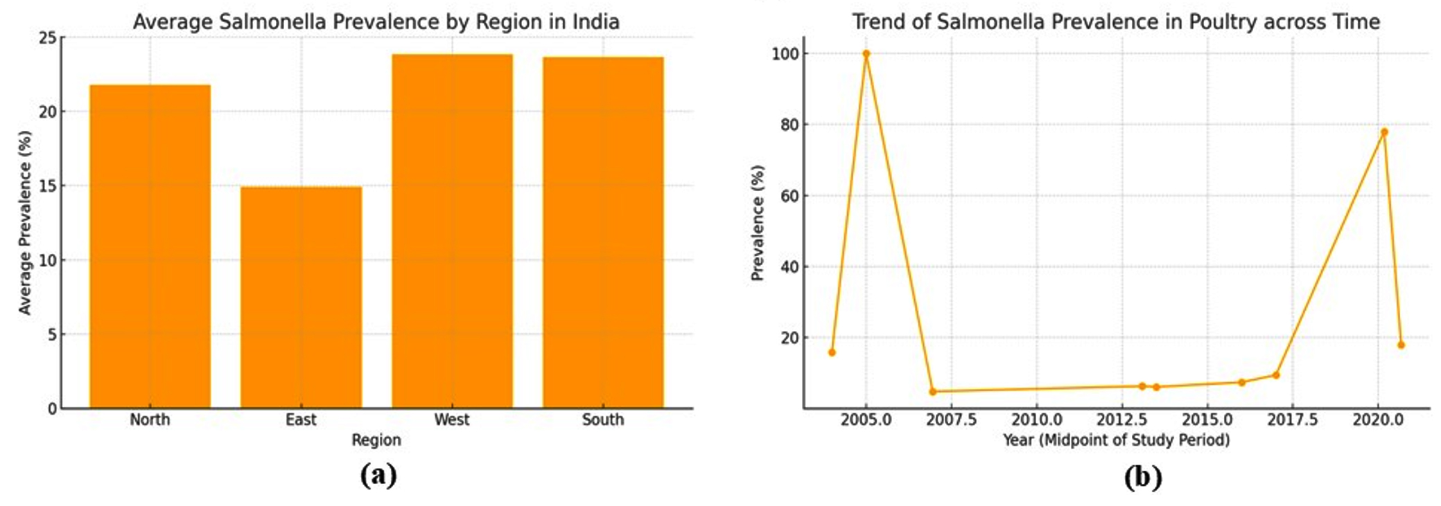 Figure 2. a) Geographical prevalence of Salmonella in Poultry Birds Across India; b) its trend over the time
