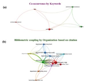 To derive deeper insights and identify research trends, a bibliometric analysis was conducted using VOS viewer a powerful text-mining and visualization software developed by Van Eck and Waltman in 2010.11 VOS viewer enables the mapping and clustering of relationships between research objects, such as keywords, authors, publications, citations, and geographic locations. In the visualizations generated, each node represents a unique term or item, while nodal distance signifies the degree of similarity or co-occurrence. The thickness of connecting lines reflects the strength of the linkage between nodes. This analytical approach allowed for the identification of key research themes, geographic trends, and collaborative networks in Salmonella research within India, offering a foundation for meaningful interpretations and future directions. The keyword co-occurrence was analyzed using full counting to identify research themes and trends. In the global dataset (1,780 documents), a threshold of at least 10 keyword occurrences was applied, while in the smaller India-specific dataset (35 documents), the threshold was reduced to 5 to capture relevant terms. For bibliographic coupling, organizations were compared based on citation impact, requiring at least two documents and 10 citations globally, and at least one document and 10 citations for the Indian dataset. At the country level, bibliographic coupling was performed using a stricter threshold of 30 documents and 500 citations, with results visualized according to the number of publications.