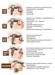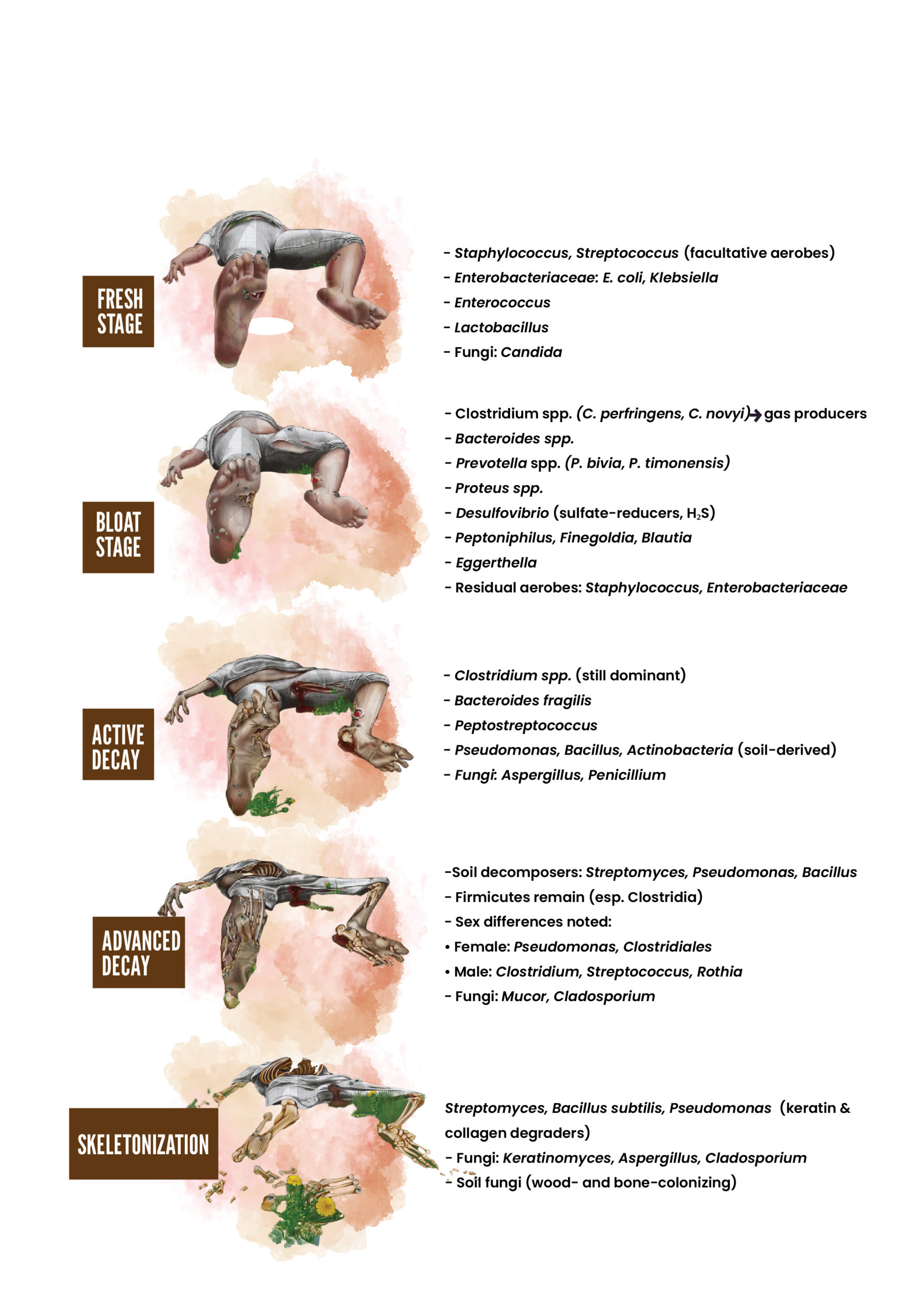 progressed.13 These observed changes in the soil’s microbial community suggest that specific microbes could be potential time-of-death indicators. However, the varying decomposition rates among different cadavers in the study highlighted the need to consider both bacterial and fungal communities to ensure the reliability of such a forensic approach. Another investigation proved that during the decomposition of a solitary adult pig carcass placed directly on a grass patch in Hammond, Louisiana, lipid biodegradation by soil bacteria was more prevalent than protein biodegradation during degradation of the carcass. This study also suggested the potential of predicting specific microorganisms linked to distinct stages of decay by identifying particular microbial assemblages (such as Group I lipase genes, Acinetobacter spp., etc.) over time. The findings and perspective reported by this study validated that the insects on carrion may alter the microbial community structure and its functioning.14 Their principal findings also showed that at different stages of decay, four dominant phyla showed distinct changes. Among the various clusters discussed, Proteobacteria, the most prevalent phylum, decreased over time, while Firmicutes became more abundant.15 Bacteroidetes were present only in the fresh and bloated stages, while the Actinobacteria communities found on the skin vanished during the dry stage. Another study suggested that the bacterial community composition varied significantly at different body locations throughout the decomposition process.11,16 In this respect, distinct shifts were noticed during the stages of bloat and purge, where fly-associated bacteria such as Wohlfahrtimonas and Ignatzschineria were prevalent until tissue desiccation or removal. Subsequently, soil-related bacteria, particularly Acinetobacter, became dominant during the later stages of dehydration and skeletonization in most examined body sites. The bacterial communities in the caecum of decaying corpses highlighted the potential of studying specific microbial taxa, such as Bacteroides and Parabacteroides, which showed a decline over time and were inversely correlated with the PMI.17 In addition, Clostridium was a strong positive predictor of the PMI. The influence of larval mass microbiology and chemistry in indicating time since death was also noted.18 According to these findings, three pig carcasses were left to decompose over three days at various intervals, and subsequent microbial analysis revealed distinct shifts in three different communities before, during, and after the 98-h mark. These variations appeared to be influenced by the oxidation-reduction potential of the larval masses. Notably, significant interactions were observed between time and microbial taxa, especially within the Firmicutes and Proteobacteria phyla. The findings suggested a promising potential for using these shifts as a tool to estimate PMI, and they offered new insights into the microbial and chemical attributes of larval masses.18 During human decomposition, microbial succession follows a predictable timeline, with shifts from facultative aerobes in the fresh stage to obligate anaerobes (such as Clostridium and Bacteroides) during bloat, followed by mixed anaerobes and soil-associated taxa in active and advanced decay, and keratin- and collagen-degrading microbes in the dry stage. Figure summarizes the predominant microorganisms associated with each stage of human body decomposition.4,19,20