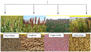 Millets were consumed as the first cereal grain for domestic purposes and are also called as “Miracle grains/Nutri-cereals.1 They are primarily cultivated in areas with less fertile soil and under farming conditions where the main cereals do not produce significant harvests.2 They are small seeded rain-fed grasses and are grown in dry areas, under marginal conditions of soil fertility and moisture. Human health is dependent on the nutritional quality of food. However, many agricultural foods are not considered as primary human food sources because of knowledge gap. Millets fall into this category. They are primarily used for animal and bird feed but they are considered as high quality nutritional food and also help in maintaining healthy life.2 Many nutritional and health benefits are attributed to the millets which are underutilized and overlooked due to a lack of awareness among the public and several challenges such as poor cooking quality, undesirable taste, and low nutritional absorption. These issues can be addressed to render millets a valuable food source for poor families and can increment their income besides overcoming malnutrition.2 Besides being enriched in carbohydrates and proteins, the health promoting properties of millets may be due to important phytochemical, vitamins and micronutrients present in them.3-5 Millets are beneficial for nutraceutical value and are known to reduce cholesterol, prevent heart disease, diabetes and cancer they also improve the muscular health and energy levels.6 Millets are the houses of multi nutrition hence they are consumed as a solution for hidden hunger and are therefore known as ‘nutricereal’. Millets also contain amino acids with a relatively high amount of methionine and the least amount of threonine.7 Some major millets also possess antioxidant properties such as foxtail millet and proso millet, they harbor tocopherols and polyphenolics.4 Although all varieties of millets are beneficial for human consumption but they vary at their nutritional level.8 Millets such as Jowar (sorghum), Bajra (pearl), Ragi (finger), little millet (Figure 1) are low-glycemic, making them ideal for diabetes, managing blood sugar, and improving gut health.