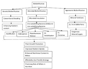 Deficiency of micronutrient is also known as ‘Hidden hunger’. It is caused due to inadequate availability of vitamins and minerals in diet. A lack of micronutrients, specifically iron and zinc, in the diet is impacting a large population of world. Iron deficiency is the most common nutritional issue. It mostly affects children’s ability to learn and their physical and mental growth. In Plants Iron (Fe) is an important micronutrient needed by the plants for physiological activities and it has the potential to reverse the chlorosis in the plant as it is reported in the biosynthesis of chlorophyll. Iron is also important for various cellular functions in plants such as, respiration, photosynthesis, and plant growth hormones and DNA and RNA synthesis. Iron-containing protein such as cytochrome contains iron which participates in the electron transport system in chloroplast and mitochondria in the plant. Many nutritional and health benefits are attributed to the millets which are underutilized and overlooked due to a lack of awareness among the public and several challenges such as poor cooking quality, undesirable taste, and low nutritional absorption. These issues can be addressed to render millets a valuable food source for poor families and can increment their income besides overcoming malnutrition. Zinc and Iron solubilizing bacteria can be used to enhance the quality and yield of millets as they have plant growth promoting activities. They increase the bioavailability of Zn and Iron to the plants by siderophore production in the soil causing acidification and chelation of these ions.
