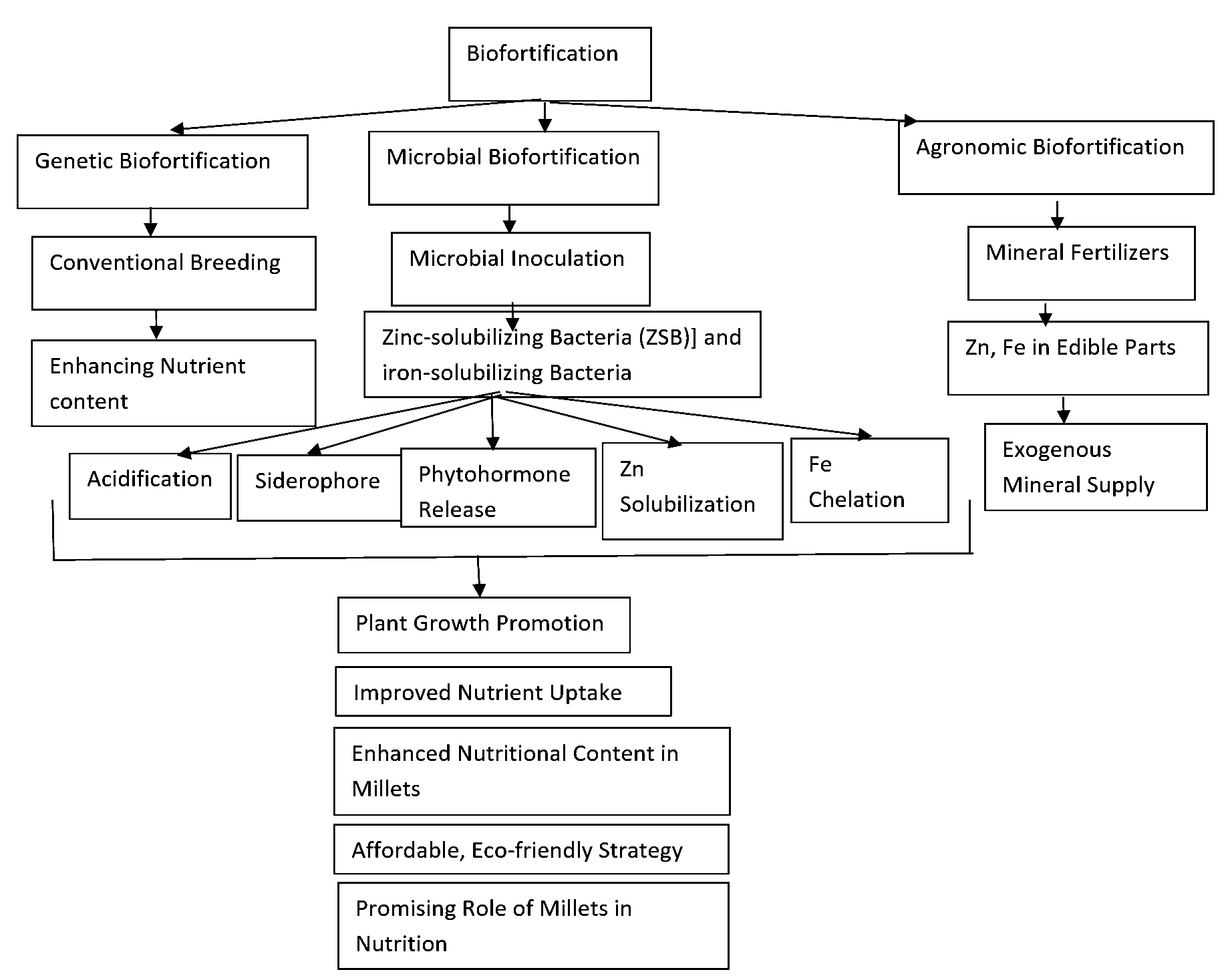 Millets are an abundant source of micronutrients with great variability and are known as Miracle Grains/Nutri-cereals. Biofortification by plant growth promoting bacteria in millet cultivars with increased levels of iron (Fe) and zinc (Zn) can significantly reduce the prevalence of their deficiencies which are common in developing countries that rely mostly on cereals for their nutritional needs and dietary energy. This paper reviews the importance of PGPR in enhancing the availability of zinc and iron in millets through mineral solubilization via siderophore production. This results in acidification of soil by releasing organic acids that binds to cations thus making them available to the plant.