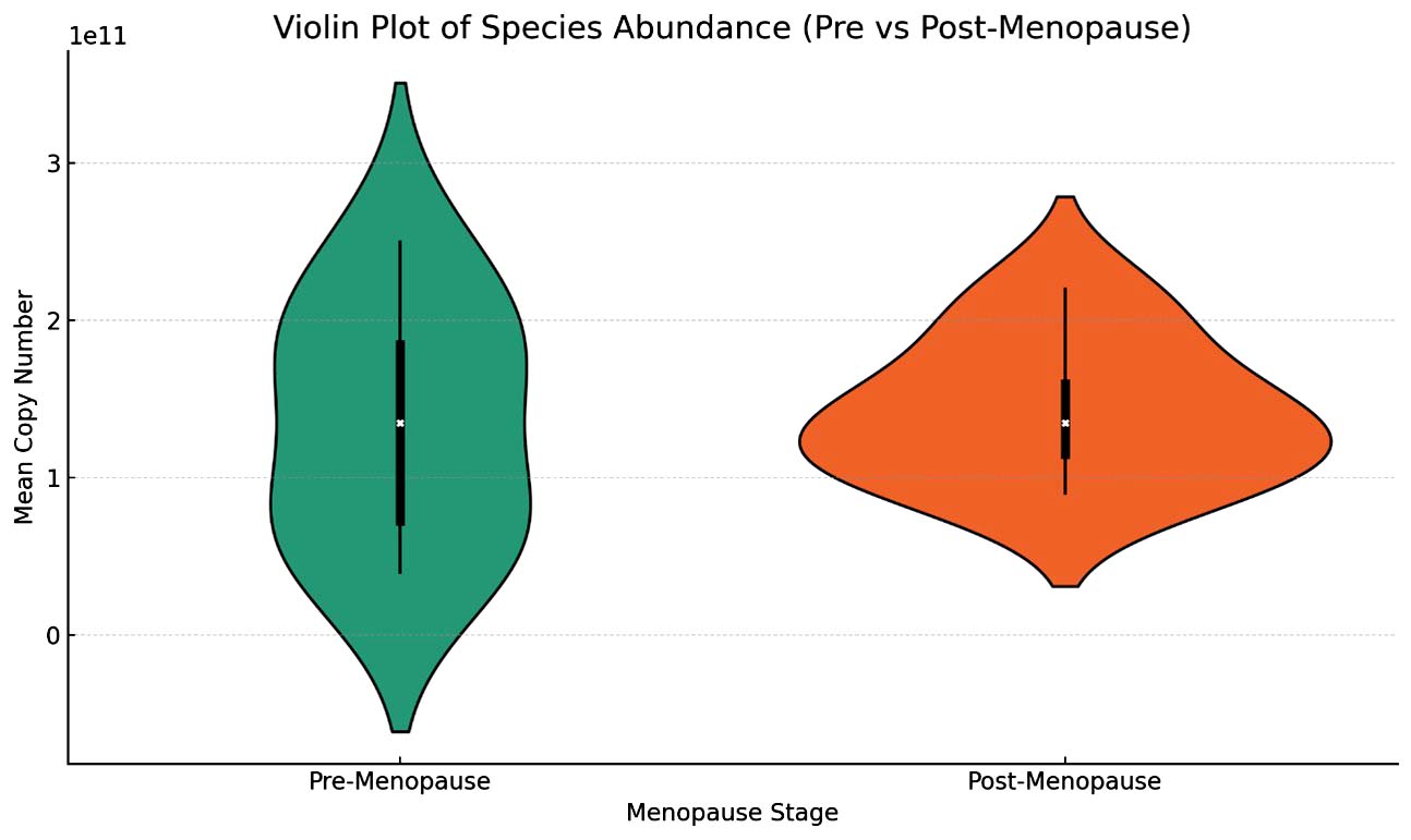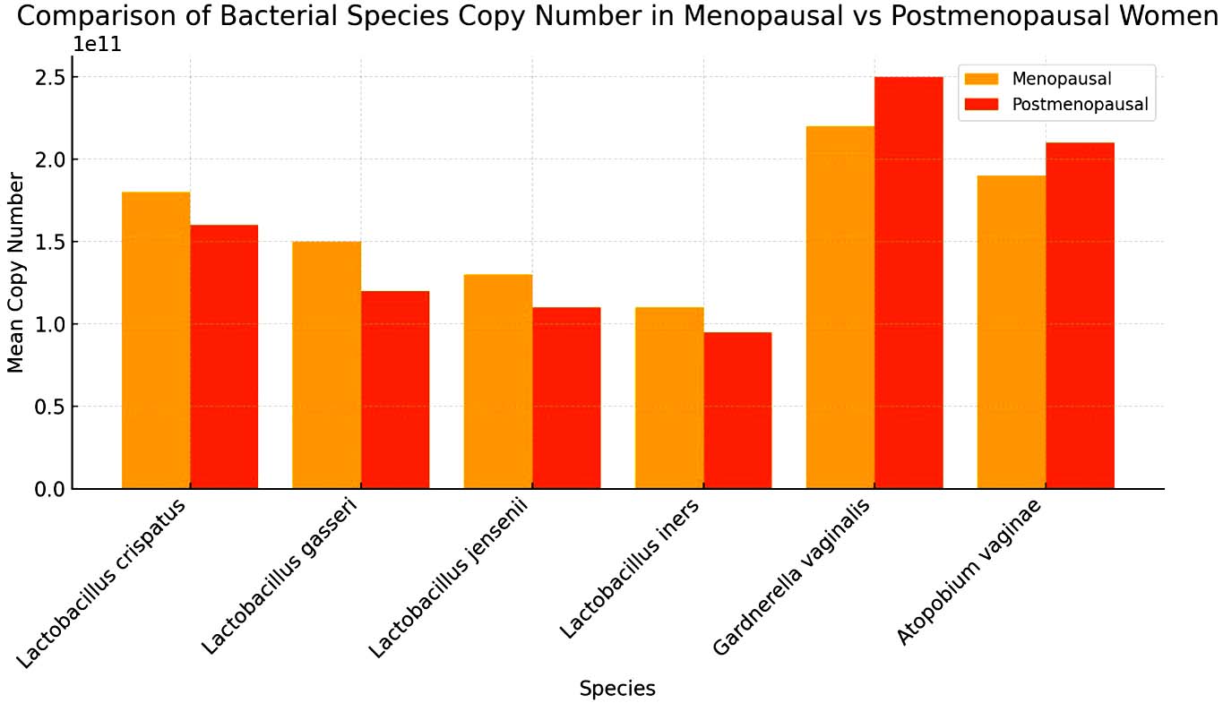 qPCR further quantified the decline in beneficial bacteria and the rise in pathogenic bacteria. Lactobacillus crispatus exhibited a significant drop in copy number, averaging 4.5 × 10¹¹ copies/mL in the premenopausal group and only 1.2 × 10¹¹ copies/mL in the postmenopausal group. Lactobacillus gasseri decreased from 2.0 × 1011 copies/mL to 0.5 × 1011 copies/mL, and Lactobacillus iners dropped from 2.5 × 1011 copies/mL to 0.8 × 1011 copies/mL (Figure 2). In contrast, pathogenic bacteria such as Gardnerella vaginalis increased from 0.3 × 1011 copies/mL in premenopausal women to 2.5 × 1011 copies/mL in postmenopausal women. Prevotella spp. increased from 0.4 × 1011 copies/mL to 3.0 × 1011 copies/mL. This dramatic shift in microbial populations indicates a progression toward vaginal dysbiosis following menopause (Figures 3 and 4).