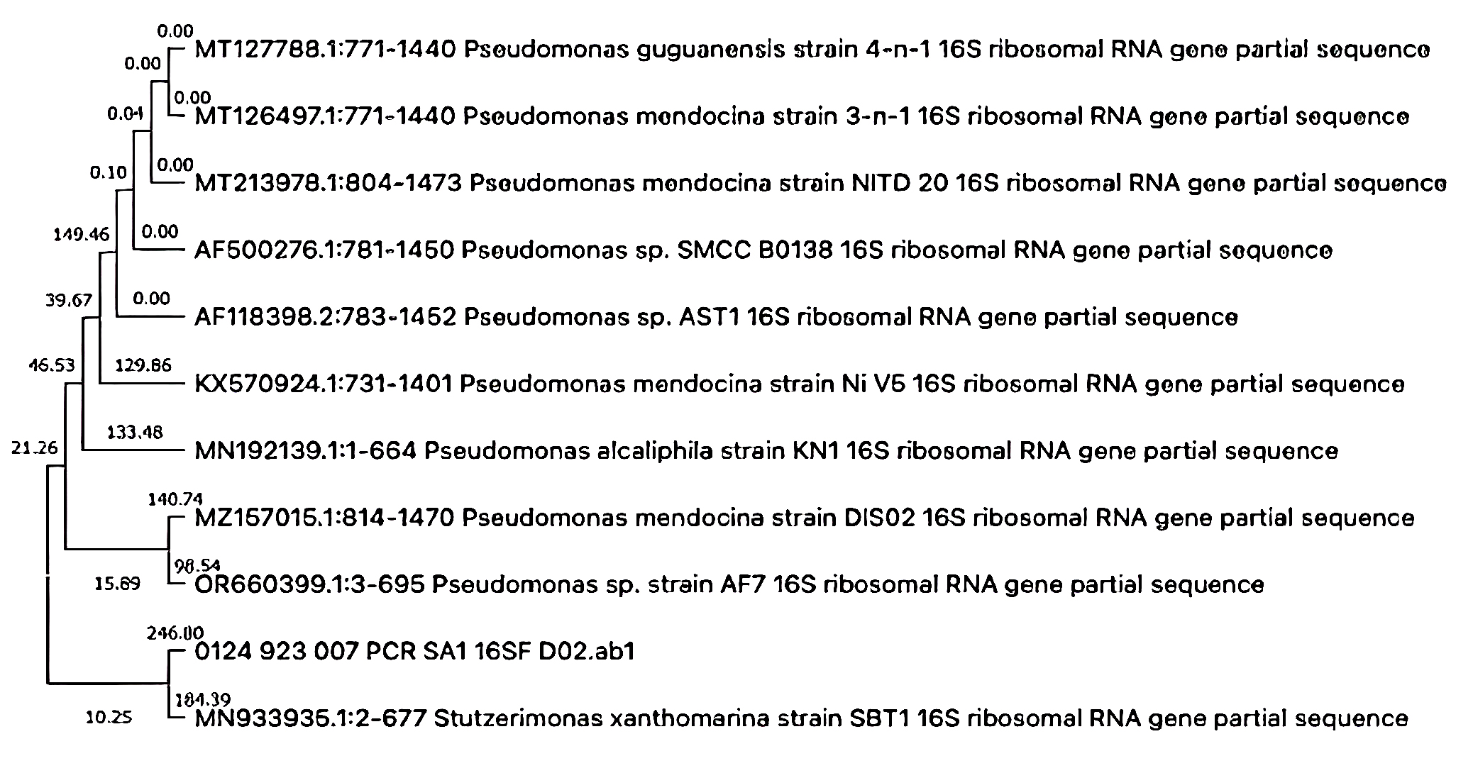 Molecular characterisation of LMSA and LMSPR was done by 16S rRNA sequencing method on BLAST analysis. The isolate identified as LMSA was Stutzerimonas xanthomarina (Figure 2) that showed 98% sequence similarity and the LMSPR as Pseudomonas pseudoalcaligenes (Figure 3) that showed 99.6% sequence similarity.