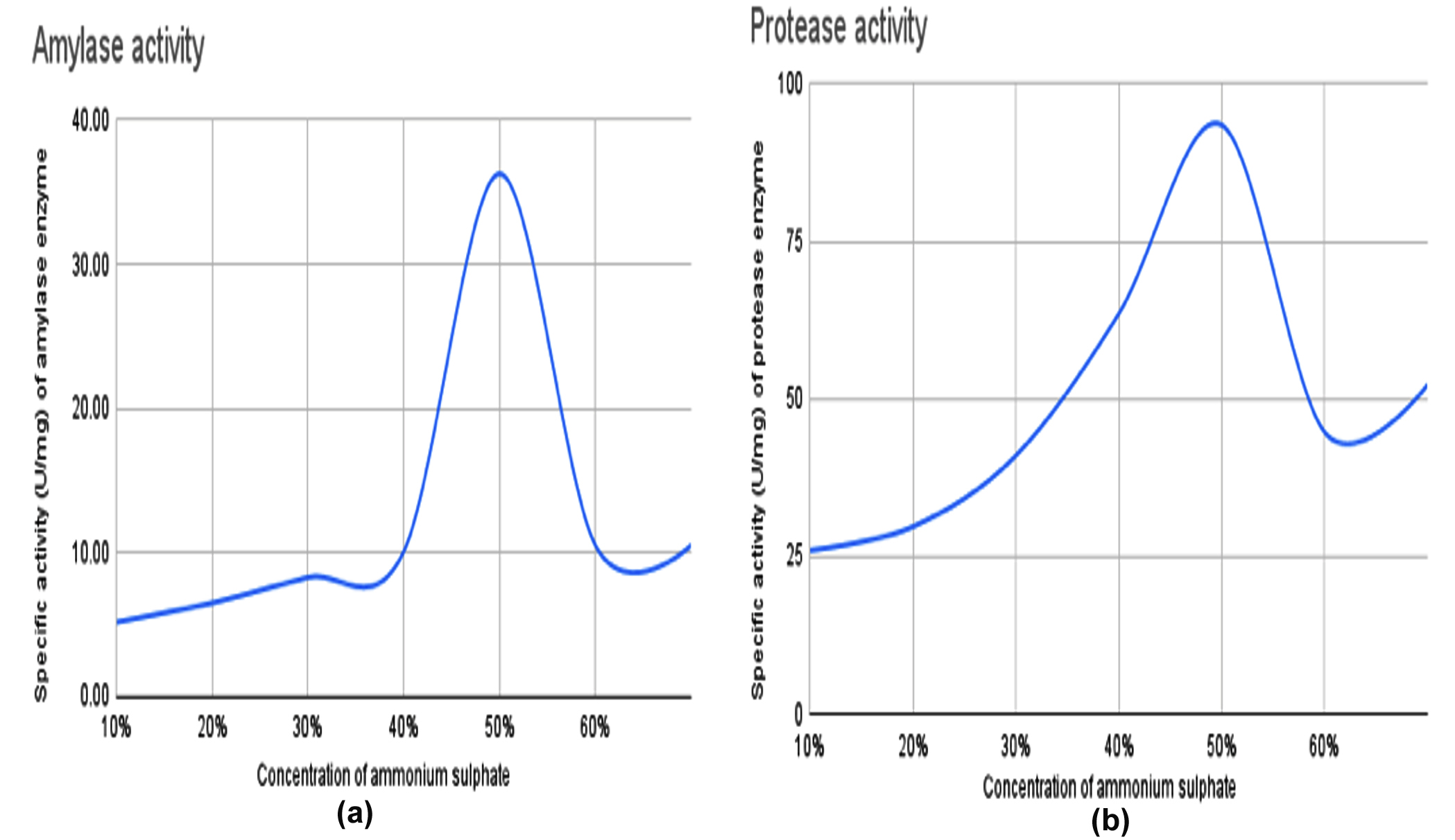 Our results align with previous reports concerning the purification and quantification of enzyme activity. Neiditch et al. observed optimal amylase activity at 60% ammonium sulfate saturation, yielding 23.95 U/mg from Bacillus spp. and 19.0 U/mg from Pseudomonas spp., consistent with our findings.34 Similarly, Shaikh et al. reported the highest protease activity at 60% ammonium sulfate saturation, suggesting that this saturation level may be broadly effective for partial purification of hydrolytic enzymes from soil microorganisms.38