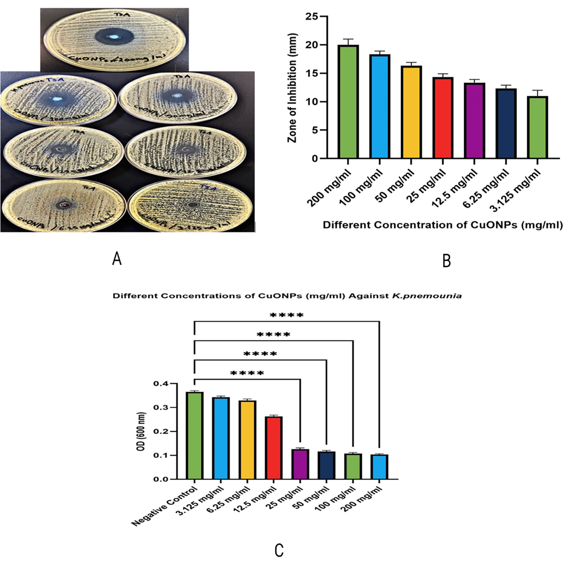 Among the top-priority diseases designated by the World Health Organization (WHO), multidrug-resistant (MDR) K. pneumoniae has arisen as a major concern for public health around the world. Persistent infections, treatment failure, and increased morbidity and mortality are greatly exacerbated by its capacity to establish strong biofilms on both host tissues and medical devices. Traditional antibiotics have a very low success rate against biofilm-associated bacteria since these microbes are up to a thousand times more resistant to these drugs.24 The increasing resistance to existing antibiotics highlights the critical need for new approaches that can eradicate K. pneumoniae in its biofilm and in its planktonic forms. Because of their diverse antibacterial mechanisms, unique physicochemical features, and ability to disrupt biofilm formation, metal-based nanoparticles like CuONPs have garnered a lot of attention in this context.25 This research looks at the phenotypic and gene expression impacts of CuONPs in K. pneumoniae, namely their antibacterial and antibiofilm capabilities. The antibacterial efficacy of CuONPs against K. pneumoniae was shown to be significantly concentration-dependent, as evidenced by the agar diffusion experiment. The inhibition zones varied from 20 mm at the maximum concentration (200 mg/ml) to 10 mm at the minimum (3.125 mg/ml), clearly demonstrating that elevated CuONP concentration improves antibacterial effectiveness (Figure 2). The results align with Khairy et al., who documented comparable dose-dependent bactericidal efficacy, with minimum inhibitory concentrations (MICs) between 62.5 and 125 µg/ml.13 Similarly, studies highlighted the efficacy of CuONPs against biofilm-forming bacteria, accentuating their therapeutic applicability in addressing illnesses linked to biofilms and antibiotic resistance.26,27 Numerous supplementary investigations have shown inhibition zones ranging from 13 to 20 mm, hence reinforcing the efficacy and dependability of CuONPs as antimicrobial agents in medical and industrial contexts.28-30 In addition to the diffusion data, optical density (OD600) tests indicated a significant reduction in bacterial growth at elevated CuONP concentrations. Specifically, concentrations of 50 mg/ml and higher (100 mg/ml and 200 mg/ml) demonstrated almost total suppression of K. pneumoniae growth, corroborating the bactericidal activity at increased dosages. This data corresponds with previous observations, indicating that lower doses displayed bacteriostatic effects, but greater amounts resulted in complete bacterial elimination.31,32 These data together highlight the significant potential of CuONPs as effective antibacterial agents, particularly in suppressing K. pneumoniae at high concentrations, hence endorsing their prospective use in therapeutic and preventative contexts.