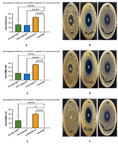 The combination antibacterial efficacy of CuONPs and antibiotics (Bactrim, Clindamycin, and Imipenem) against K. pneumoniae was assessed by the disc diffusion technique as described by Alnuaimi et al and Murugn.17,18 Antibiotic discs and CuONPs solutions were produced separately and kept correctly. Standardized bacterial suspensions were injected onto Tryptic Soy Agar plates to create a homogenous bacterial lawn. Antibiotic discs, nanoparticle solutions, and their mixtures were used on these plates. Following incubation at 36 ± 1 °C for 24 hours, inhibition zones were quantified to evaluate antimicrobial effectiveness. Each experiment was conducted in triplicate to ensure precision and repeatability, to identify synergistic interactions for possible therapeutic uses against resistant bacteria.