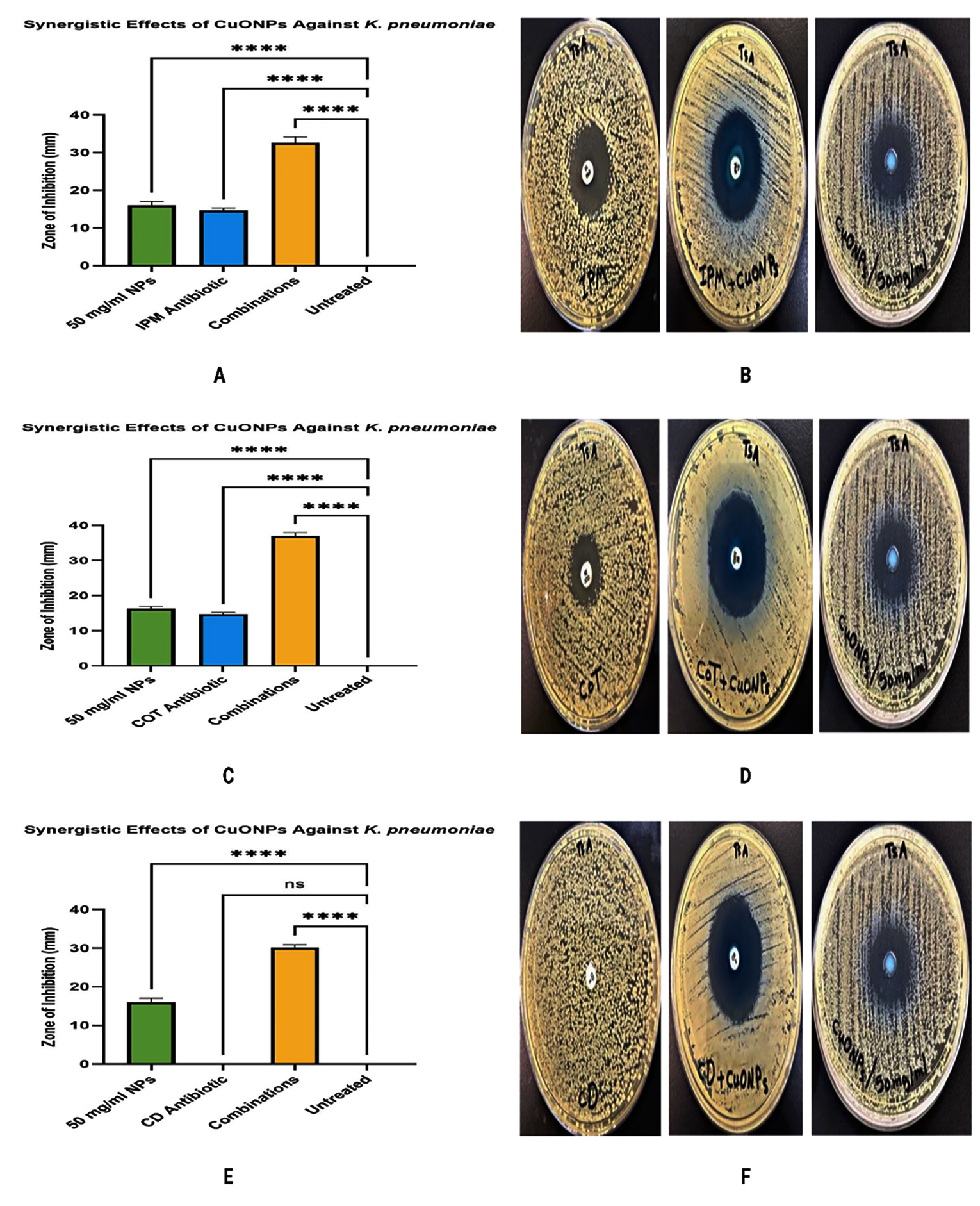 The synergistic effect of CuONPs with antibiotics was evaluated using the disc diffusion method, providing preliminary qualitative evidence of enhanced antibacterial activity. This method is ineffective in obtaining measurable values for interaction strength. The checkerboard assay, which assesses the Fractional Inhibitory Concentration Index (FICI), is considered the gold standard for synergy evaluation. Checkerboard analysis was omitted from this study owing to constraints in resources and time. We acknowledge this as a constraint and recommend that future studies incorporate checkerboard assays and time-kill synergy experiments to validate and quantify the observed interactions. This work demonstrated substantial synergistic antibacterial activity of CuONPs in conjunction with the medicines imipenem (IPM), cotrimoxazole (COT), and clindamycin (CD) against K. pneumoniae. CuONPs combined with IPM notably enhanced antibacterial efficacy, significantly reducing bacterial proliferation and resistance compared to treatments with each agent alone, as shown in Figure 3, as corroborated by recent studies by Rand6 and Valadbeigi et al.33 Similarly, combining CuONPs with cotrimoxazole markedly increased the inhibition zone to 37 mm, surpassing the effects of CuONPs (16.3 mm) or cotrimoxazole (14.7 mm) individually. This synergy likely results from nanoparticle-induced membrane disruption enhancing antibiotic penetration, aligning with findings from Javadi et al.34 Furthermore, the combination of CuONPs with clindamycin dramatically restored antibacterial activity against K. pneumoniae, producing a substantial inhibition zone (~30-31 mm) compared to negligible effects from clindamycin alone. This pronounced synergy appears driven by CuONP-mediated membrane damage, oxidative stress, and increased antibiotic uptake, thereby extending the spectrum of clindamycin to include Gram-negative pathogens, supported by previous work from Quintero-Garrido et al.35 and Alazavi.36 Collectively, these findings highlight CuONPs’ potential as robust adjunctive agents capable of overcoming bacterial resistance and enhancing antibiotic effectiveness against multidrug-resistant K. pneumoniae.37,38