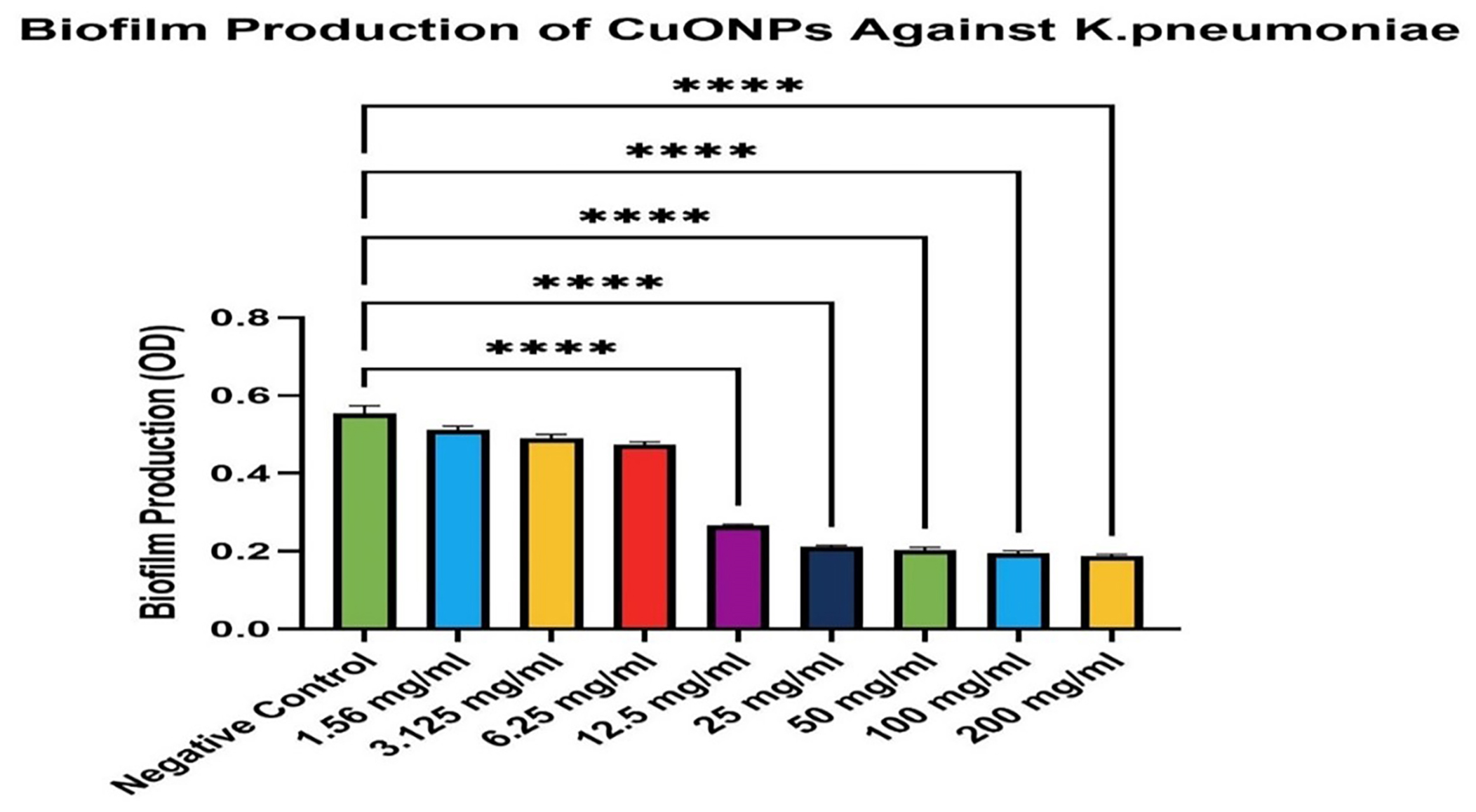 Figure 4. One-way ANOVA with Dunnett’s multiple comparisons test showed a significant reduction in biofilm compared to the negative control (P < 0.0001). Results are shown as mean ± SEM, with error bars representing standard deviation (SD) from three independent experiments (n = 3)