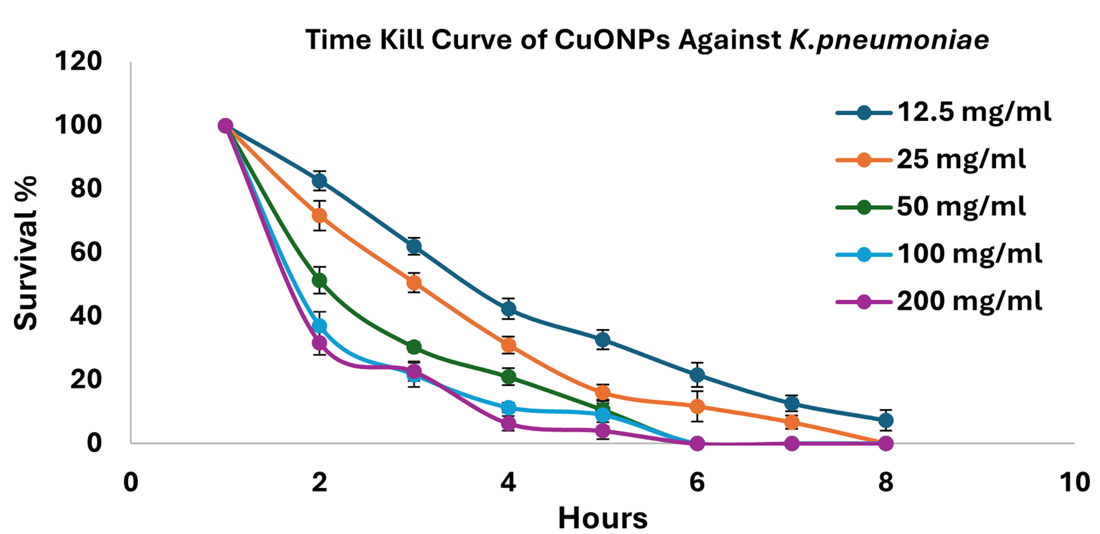 The time-kill curve analysis revealed a distinct concentration-dependent bactericidal action of CuONPs on K. pneumoniae. Elevated doses (200 mg/ml and 100 mg/ml) rapidly reduced bacterial viability, attaining almost total elimination within 6 hours. Reduced doses (50, 25, and 12.5 mg/ml) exhibited reduced bacterial reduction rates, with the lowest dosage (12.5 mg/ml) permitting the survival of some viable bacteria even after 8 hours. These results corroborate prior studies, highlighting the significant antibacterial efficacy of CuONPs at elevated dosages (Figure 5).