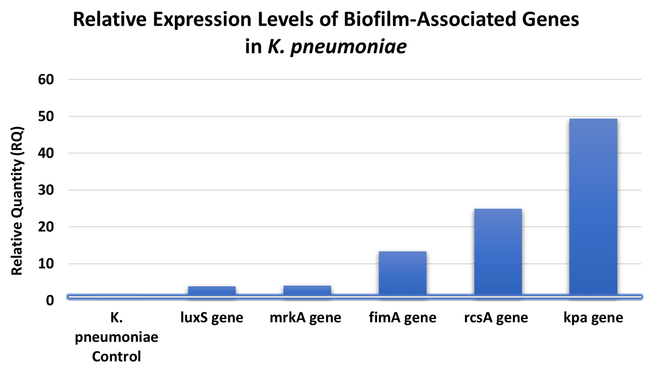 Figure 6. Gene expression was quantified by RT-qPCR and expressed as relative quantity (RQ) compared to the untreated control. All tested genes (luxS, mrkA, fimA, rcsA, and kpa) showed significant upregulation, with kpa exhibiting the highest expression (49.36-fold), indicating strong activation of adhesion and biofilm-related pathways in response to CuONPs
