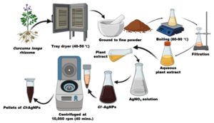 Curcuma longa (Cl), generally recognized as turmeric, has been thoroughly investigated for its medical benefits and has recognized to be a brilliant option for AgNPs biosynthesis. The biologically synthesized AgNPs using Cl-rhizome extracts enhance their stability and dispersion while imparting bioactive properties that improve their therapeutic efficacy.15 The medicinal potential of the Cl-rhizome is primarily attributed to its rich composition of secondary metabolites, which have been traditionally utilized for treating various ailments, including inflammation and wound healing.16 Cl, often known as the “Indian saffron” or “Golden spice”, is a Zingiberaceae family member. It is popular for its vivid yellow-orange hue and unique flavor, rendering it a fundamental component of South Asian cuisine. Besides its culinary importance, turmeric has diverse applications in other fields.17,18 India considerably cultivates turmeric, accounting for around 80% of world production, whereas the United States of America is the leading importer.19 The bioactive compound curcumin, a polyphenol extracted from the Cl-rhizome, exhibits diverse pharmacological properties. It possesses antibacterial, antiviral, anti-inflammatory, anticancer, neuroprotective, antidepressant, hepatoprotective, antiallergic, and antioxidant effects, making it a hot topic for significant scientific interest.20,21