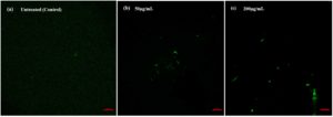 The DCFDA test was utilized to evaluate intracellular ROS generation in E. coli subsequent to treatment with Cl-AgNPs. The mechanism of antibacterial application indicates oxidative stress, which plays a pivotal role and leads to the emergence of green fluorescence in the treatment of bacterial cells, which signifies increased ROS levels. Nonetheless, it is essential to acknowledge that this experiment yielded only qualitative evidence of ROS generation. Quantitative fluorescence intensity measurements using a microplate reader or flow cytometer were not performed due to instrumentation constraints. Future studies should incorporate quantitative ROS analysis to strengthen the mechanistic understanding of Cl-AgNP-induced bactericidal activity.