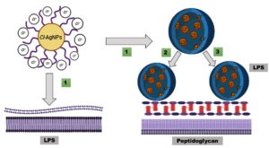 Figure 8. Schematic representation of the interaction between Cl-AgNPs and bacterial cell wall components. (1) Cl-AgNPs approach the bacterial surface and initially interact with lipopolysaccharides (LPS) in E. coli, (2) Cl-AgNPs adhere to the external surface of the peptidoglycan protective layer in S. aureus, disrupting cell wall integrity. (3) In E. coli, after LPS interaction, Cl-AgNPs penetrate and interact with the underlying peptidoglycan layer, enhancing antimicrobial activity through ROS generation and membrane destabilization