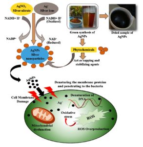surface-area-to-volume, fervent catalytic activity, and variations in size and shape, contribute to their antibacterial efficacy.9 However, despite extensive research, the precise mechanisms underlying their antibacterial action remain incompletely understood.10-12 Plant-based methods, among various biosynthesis approaches, have gained prominence because of natural phytochemicals that enact as reducing as well as stabilizing agents. Plant extracts provide an effective strategy for the environment-friendly synthesis of AgNPs, owing to their abundant constituents of phytochemicals, encompassing both primary and secondary metabolites. These bioactive compounds behave as natural stabilizing and reducing agents, enabling the conversion of Ag+ to Ag° while ensuring NP stability.13,14