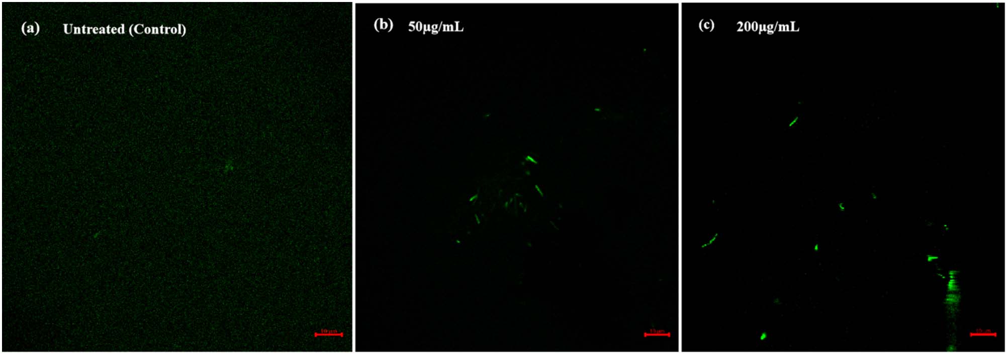 The DCFDA test was utilized to evaluate intracellular ROS generation in E. coli subsequent to treatment with Cl-AgNPs. The mechanism of antibacterial application indicates oxidative stress, which plays a pivotal role and leads to the emergence of green fluorescence in the treatment of bacterial cells, which signifies increased ROS levels. Nonetheless, it is essential to acknowledge that this experiment yielded only qualitative evidence of ROS generation. Quantitative fluorescence intensity measurements using a microplate reader or flow cytometer were not performed due to instrumentation constraints. Future studies should incorporate quantitative ROS analysis to strengthen the mechanistic understanding of Cl-AgNP-induced bactericidal activity.