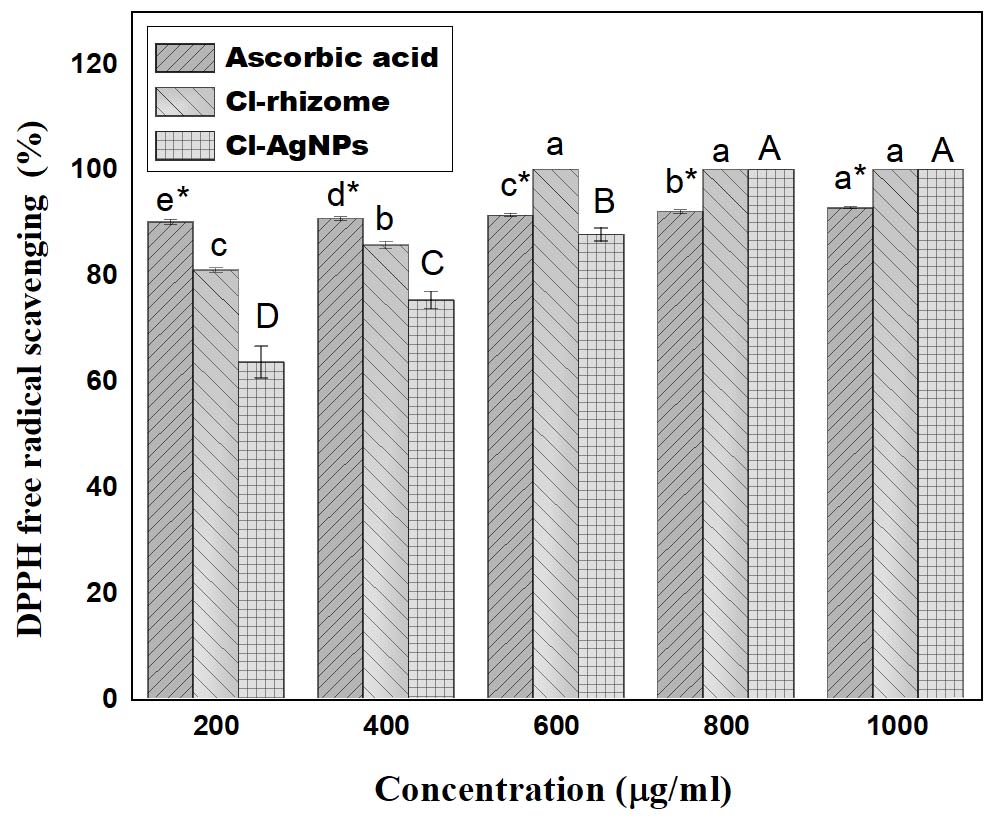 The antioxidant radical scavenging capacity of Cl-rhizome extracts and Cl-AgNPs was assessed using the DPPH assay. Different concentrations (200, 400, 600, 800, and 1000 µg/ml) of Cl-AgNPs, Cl-rhizome extract, and ascorbic acid as a reference standard were used. Each test sample was individually added in a 1:1 ml ratio of DPPH with extract and AgNPs, and was kept for 30 min. in the dark at 37 °C. The absorbance (517 nm) was recorded using a spectrophotometer. Methanol served as the blank, while ascorbic acid included as the positive control.34,35 The free radical scavenging activity (%) was calculated using Equation (1).