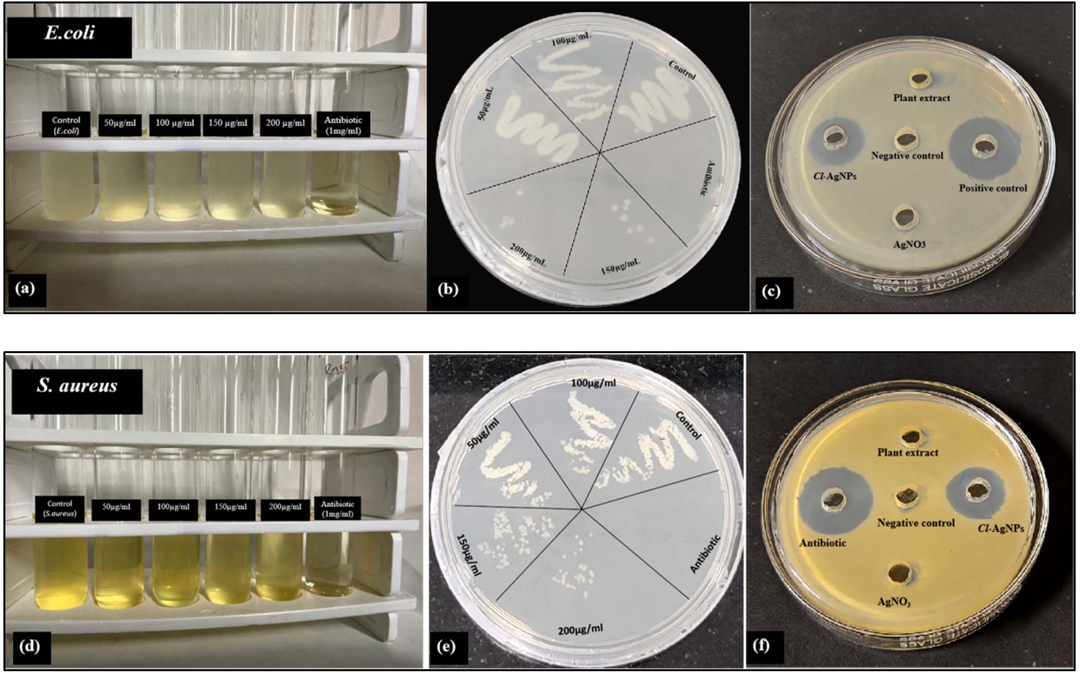 The broth dilution technique was used to reveal the MIC of Cl-AgNPs for E. coli and S. aureus. Cl-AgNPs were added to fresh bacterial cultures at concentrations of 50, 100, 150, and 200 µg/ml. The MIC for E. coli was observed to be 100 µg/ml, since observable growth was completely inhibited at this concentration. Compared to Cl-AgNPs, S. aureus had a lesser sensitivity with a MIC of 150 µg/ml. These findings suggest that E. coli is more prone to synthesized NPs than S. aureus, probably due to cell wall differences.38