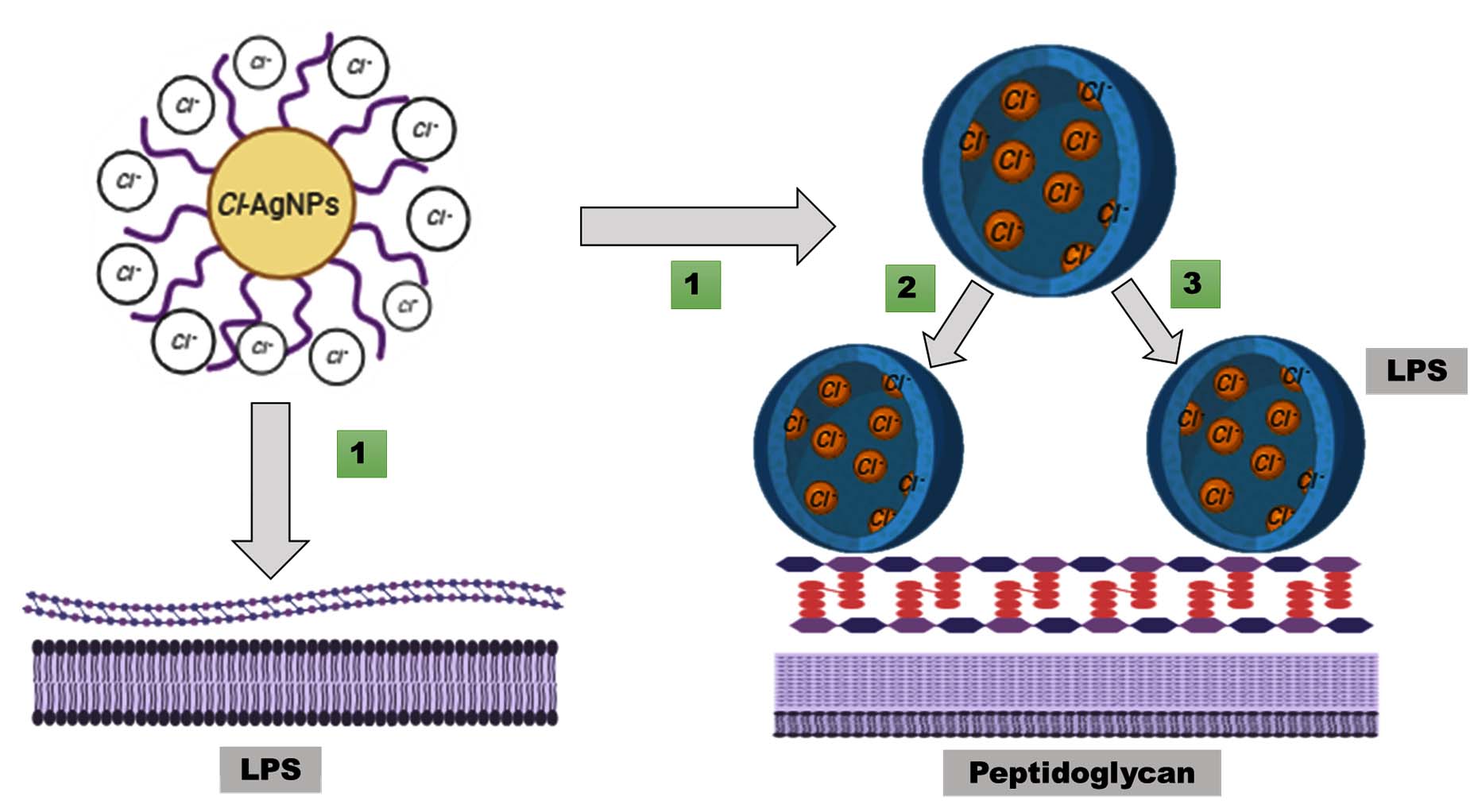 Figure 8. Schematic representation of the interaction between Cl-AgNPs and bacterial cell wall components. (1) Cl-AgNPs approach the bacterial surface and initially interact with lipopolysaccharides (LPS) in E. coli, (2) Cl-AgNPs adhere to the external surface of the peptidoglycan protective layer in S. aureus, disrupting cell wall integrity. (3) In E. coli, after LPS interaction, Cl-AgNPs penetrate and interact with the underlying peptidoglycan layer, enhancing antimicrobial activity through ROS generation and membrane destabilization