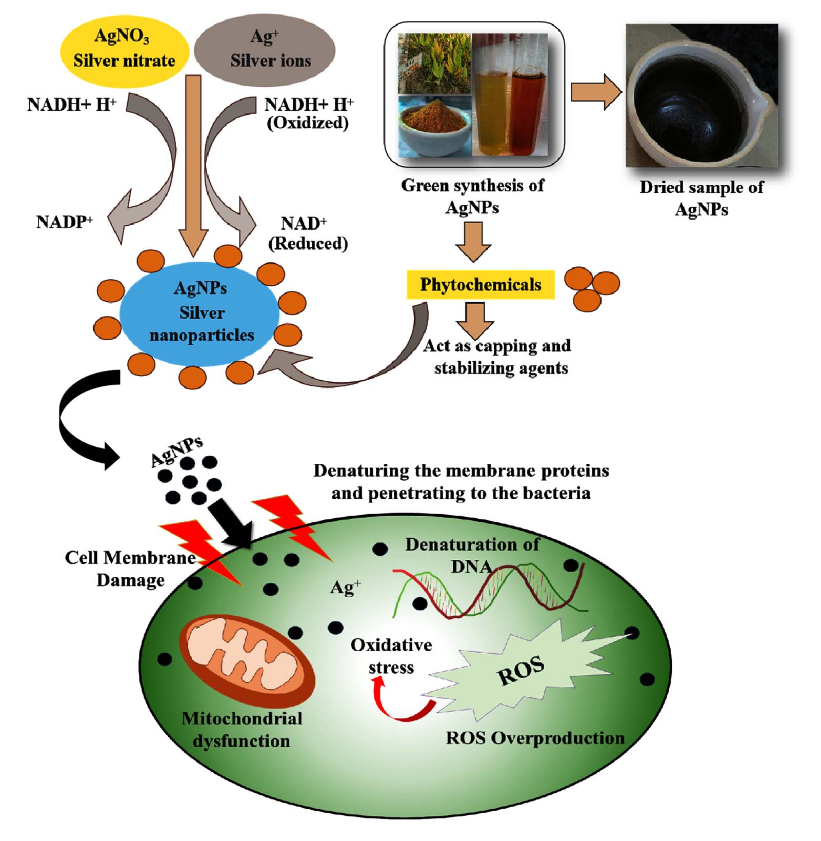 Nanotechnology has surfaced as a potential transformer of the healthcare by introducing advanced approaches to find alternative solutions to diagnose, treat, and prevent a plethora of maladies.1 The surge in global prevalence of microbial diseases, together with the limitations of traditional therapeutics, has generated significant interest in metallic nanoparticles (NPs), especially AgNPs, for biomedical applications. These breakthroughs have not only enriched therapeutic strategies but also fostered innovations in targeted drug delivery and environmental remediation.2 NPs are generally formed using two primary approaches: bottom-up and top-down. The top-down methodology necessitates employing physical processes to split up larger materials into a nanoscale structure, such as high-energy radiation and high-pressure techniques.3 In the meantime, the bottom-up technique uses chemical and/or biological substances to put together nanomaterials from molecules or atoms. Various methods, involving the sol-gel process and chemical precipitation, are employed to regulate the configuration of nanoscale structures. While chemical synthesis is frequently used, it often creates hazardous by-products that pose harmful environmental threats. Biological synthesis, on the other hand, leverages natural resources like microbes and plants, which serve as reducing as well as stabilizing agents, synthesizing nanomaterials that are not very hazardous.4,5