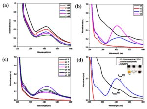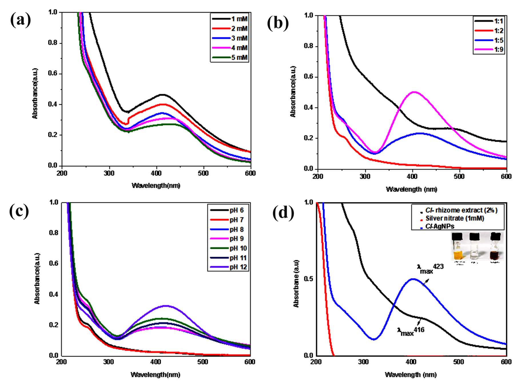 Figure 2. Synthesis of Cl-AgNPs using the standardized conditions: (a) Precursor concentration (1-5 mM), (b) Plant extract-precursor ratio graph of Cl-AgNPs with different ratios, (c) UV-Vis graph of Cl-AgNPs showing absorbance at different pH, (d) UV-Vis graph of Cl-rhizome extract (2%), AgNO3 (1 mM), and Cl-AgNPs