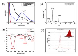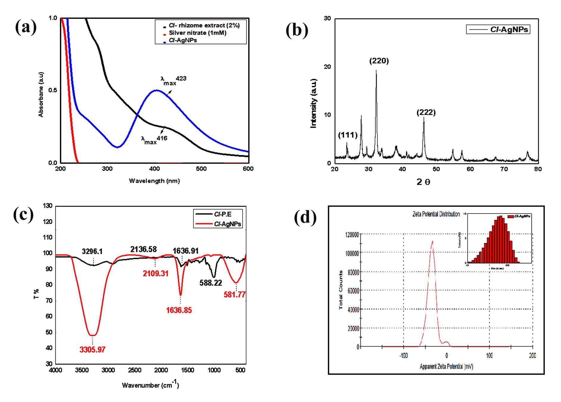 Figure 3. Analysis of Cl-AgNPs: (a) UV-Vis graph shows Cl-rhizome extract, AgNO3, and Cl-AgNPs, (b) XRD peaks confirm the fcc crystalline nature of Cl-AgNPs, (c) FTIR graph of Cl-rhizome extract and Cl-AgNPs, (d) DLS histogram of Cl-AgNPs showing Zeta size and Zeta potential values indicating the stability of Cl-AgNPs