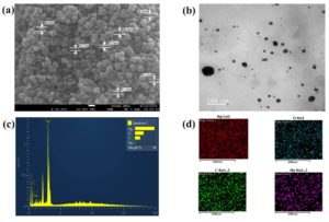 Figure 4. (a) SEM image of Cl-AgNPs revealed spherical shape observed under 50,000x magnification at 100 nm, (b) HR-TEM image of Cl-AgNPs by drop cast method at 100 nm, (c) Elemental detection analysis of Cl-AgNPs indicating the existence of Ag+ at 3 KeV, (d) Silver (red colour) in Cl-AgNPs at 250 nm in elemental mapping, indicating successful coating