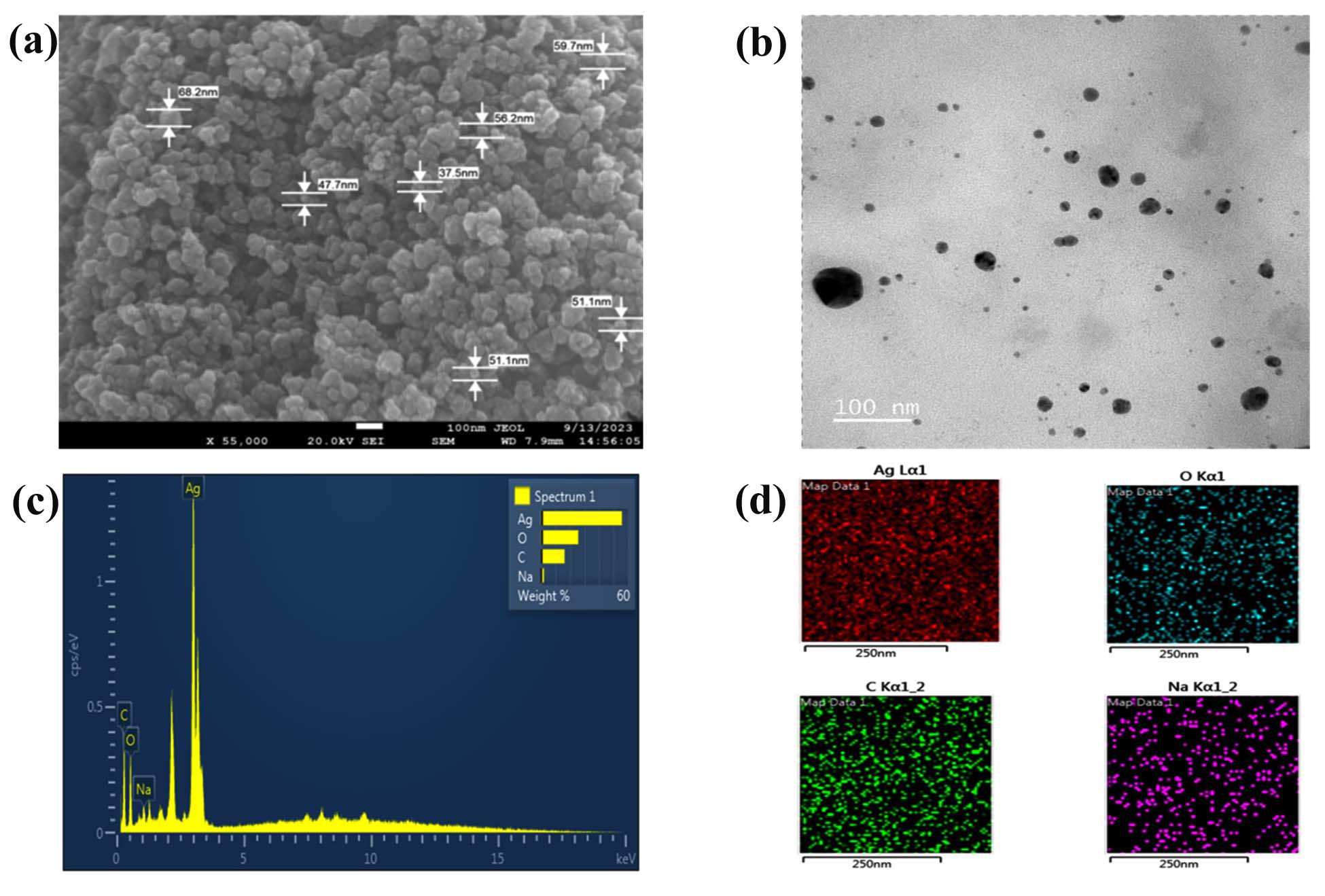 The elemental composition of Cl-AgNPs and quantitative analysis were characterised by using the EDAX. A prominent absorption peak corresponding to elemental silver was observed at 3 keV, as depicted in Figures 4c and 4d. The EDAX graph depicts the presence of carbon (C), oxygen (O), sodium (Na), and silver (Ag) in the powdered sample, with their respective proportions of 16.34%, 25.70%, 2.04%, and 55.92%, as detailed in Table. These results confirm the effective synthesis of Cl-AgNPs and provide insight into their elemental composition.