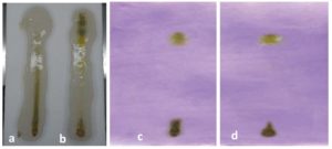 Figure 2. Bioautograms: (a) Developed bioautogram of chloroform extract with 1% molten agar S. pneumoniae solution, (b) Developed bioautogram of ethanolic extract with 1% molten agar E. coli solution, bioautogram of (c) chloroform and (d) ethanolic extract of F. indica after staining with FCR/derivatization with FCR