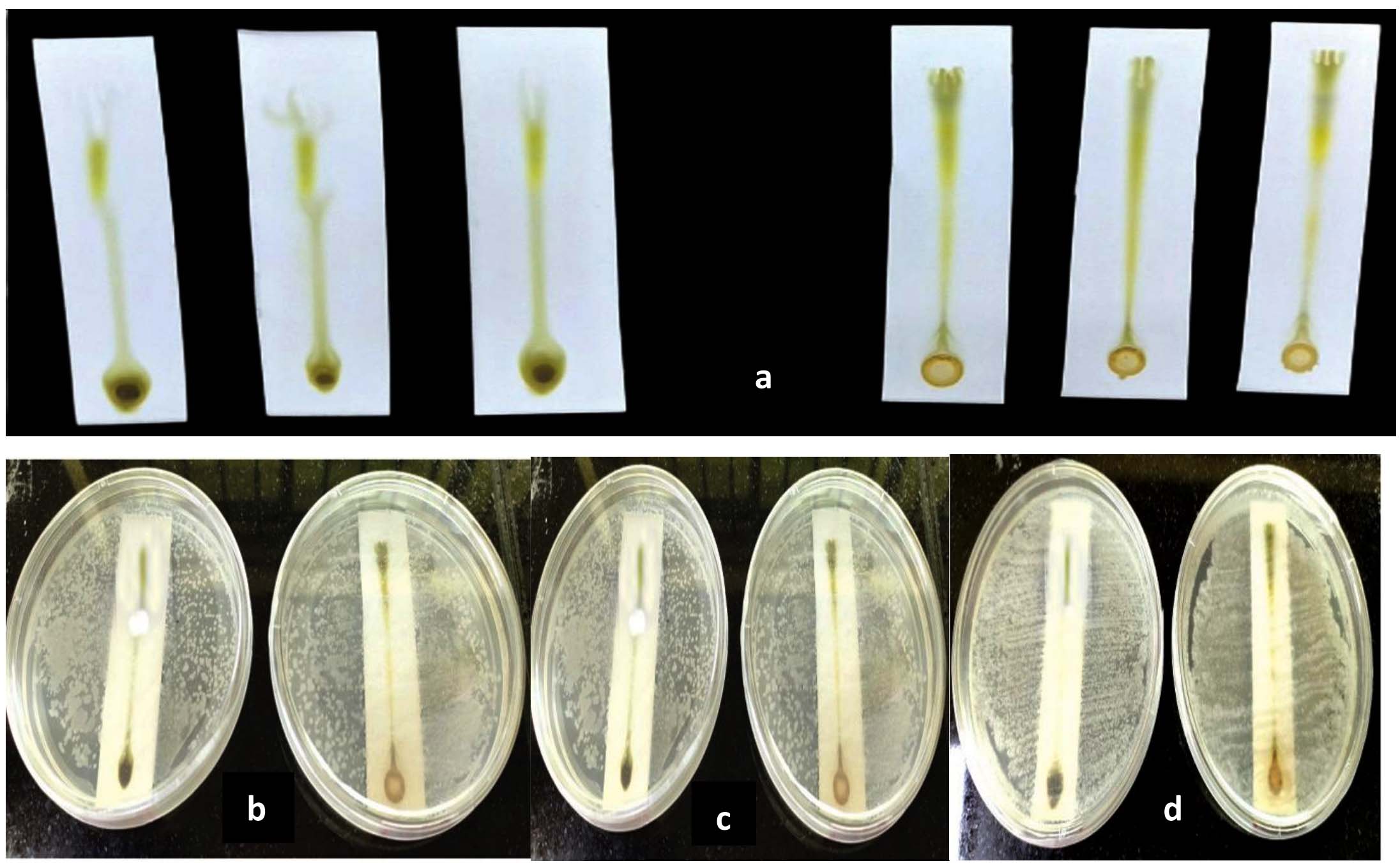 Figure 1. Bioautography Screening: (a) Developed chromatograms of chloroform and ethanolic extract of F. indica on TLC silica gel 60 F254 plates, Bioautogram screening of chromatograms (TLC-IB) against: (b) Streptococcus pneumoniae, (c) Escherichia coli (d) Vibrio cholerae. Eluent system ethyl acetate: Benzene (1:5)