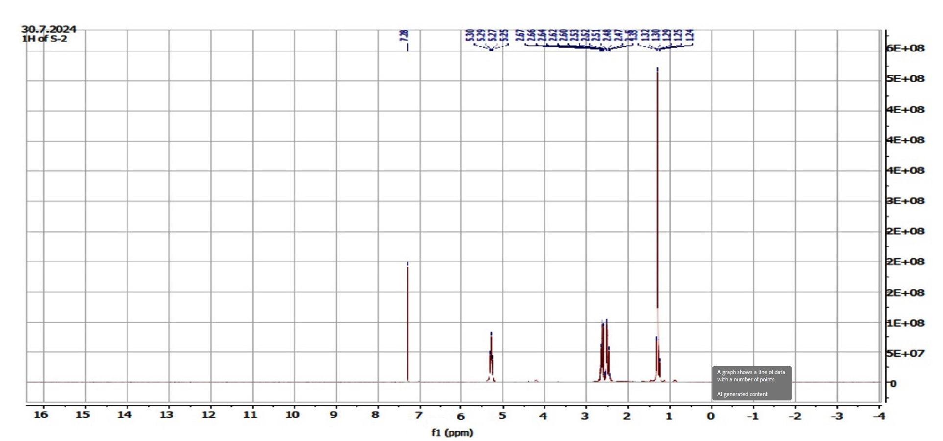 Figure 3. NMR Spectroscopy of chloroform extract of F. indica. 1H NMR (400 MHz, CDCl3): δ 1.27 (d, J = 6.4 Hz, 7H), 2.47 (dd, J = 6 Hz, 2H), 2.61 (dd, J = 7.6 Hz, 2H), 5.25 (q, J = 6.4 Hz, 2H)