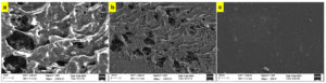 The surface morphology of the control film and PVA/PEG/JSE BDF differs significantly according to SEM analysis (Figure 2). The PVA/PEG SEM images show a relatively smooth and homogeneous surface with some slight imperfections, indicating a well-mixed polymer blend, similar to the earlier polymer blend study.38 The surface morphology of PVA/PEG films reflects the homogeneous distribution of both polymers, resulting in a coherent structure with minimum phase separation39 reported that the PVA/PEG mix had a homogeneous phase with no phase separation, indicating good miscibility of PVA and PEG. In this study, the biodegradable film (PVA/PEG/JSE BDF), which included jamun seed extract along with PVA/PEG, exhibited a rougher, porous, and more textured morphology (Figure 2a,b,c), indicating the attachment of plant compounds. This could enable and improve the swelling nature and thus increase the biodegradability of PVA/PEG/JSE BDF. These results agree with those of Bukhary et al., who developed a biodegradable film using sodium alginate, guar gum, and PVA with a porous nature, which enabled and improved the swelling property and thus increased the biodegradability.40 This altered surface is likely due to the jamun seed extract’s components influencing the film’s microstructure, with bioactive compounds potentially creating a more complex surface.13,41 In turn, this surface modification may contribute to improved interaction between the film and its environment, potentially enhancing properties such as antimicrobial activity or resistance to moisture and gases, and it directly correlates with the biodegradable mechanism due to the roughness and porosity surface area and binding.42