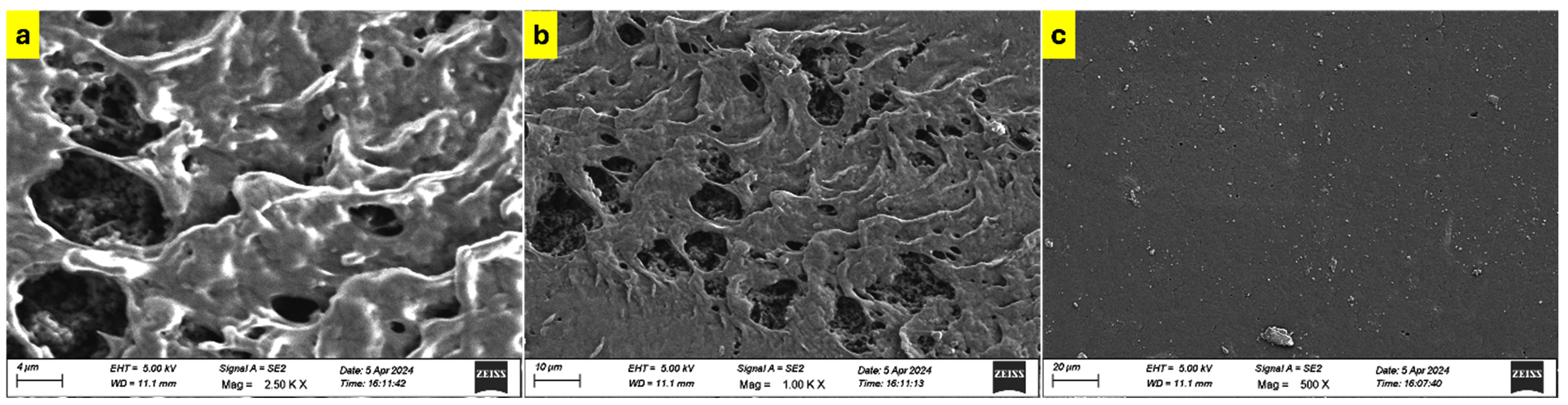 Carl Zeiss Gemini-300 High-Resolution Scanning Electron Microscope is used to analyse the morphological features of PVA/PEG/JSE BDF and the control film. Mounted on aluminium stubs with conductive carbon tape sprayed with chromium under vacuum pressure, the film samples are subjected to an accelerating voltage of 10 kV during the examination.35