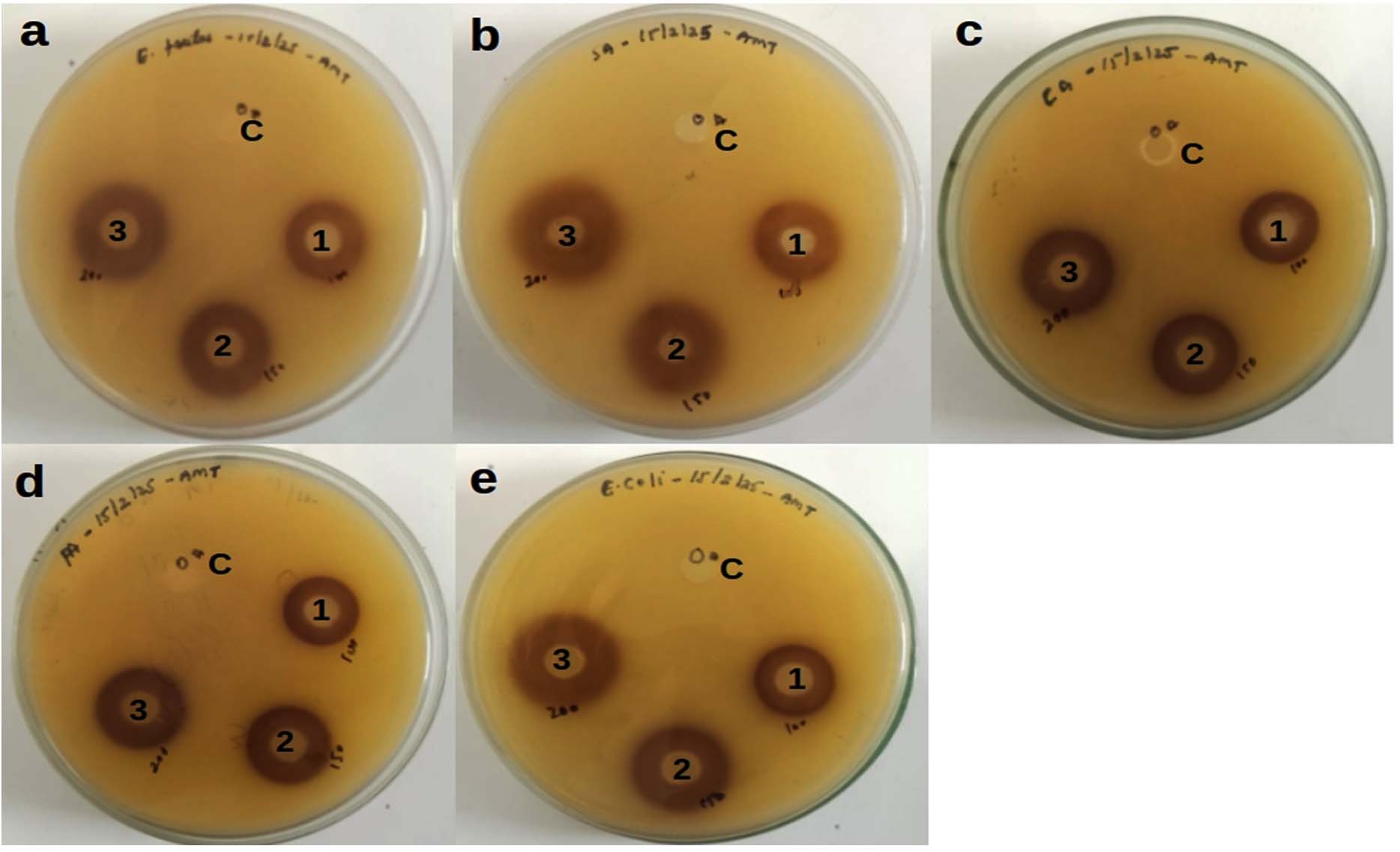 Figure 3. Antimicrobial activity of Jamun seed Extract (a) Enterococcus faecalis, (b) Staphylococcus aureus, (c) Candida albicans, (d) Pseudomonas aeruginosa, (e), Escherichia coli