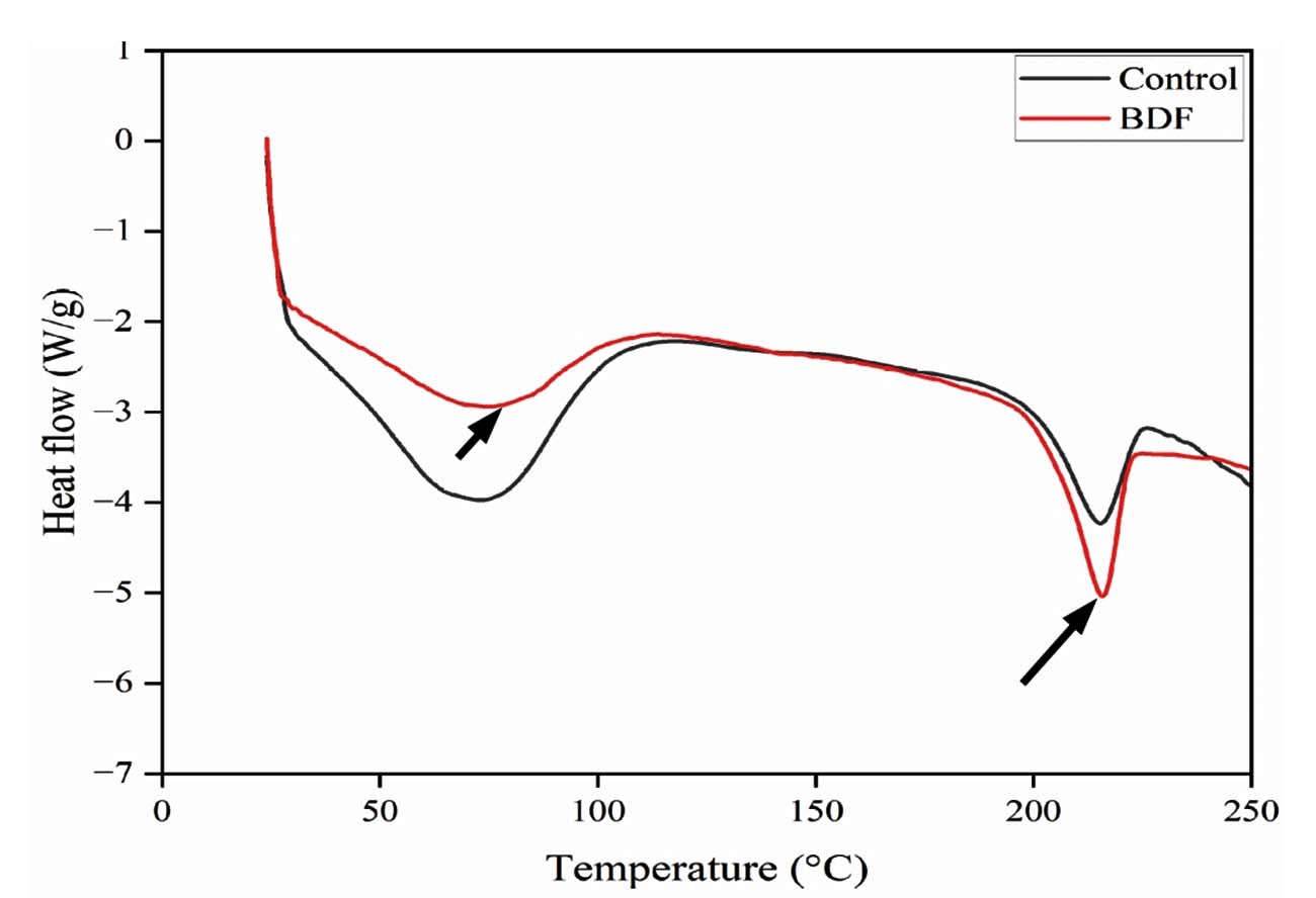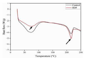 The DSC Q20 model instrument was used to analyse DSC experiments in a nitrogen atmosphere at temperatures ranging from 30-200 °C. The heating and cooling rates were 10 °C/min and 100 °C/min from 30-200 °C and 200-30 °C, respectively, to eradicate the influence of thermal history. The thermal history was removed, and the DSC profiles of the film samples were obtained at a heating rate of 10 °C/min from 30 to 200 °C.35