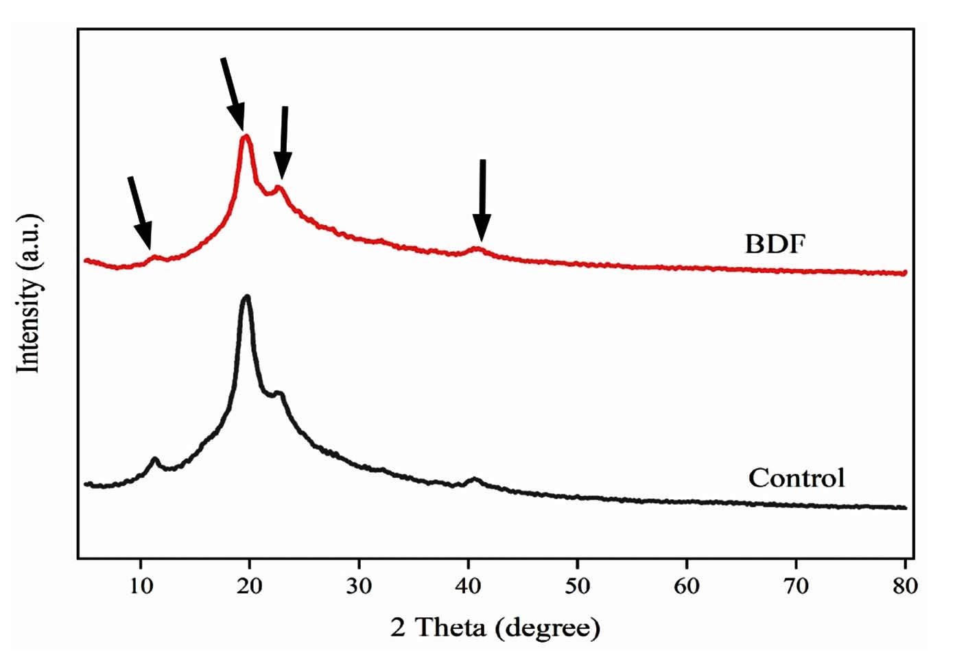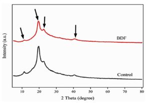 The X-ray diffraction (XRD) analysis of PVA/PEG/JSE BDF and control samples was carried out using CuKa radiation (l = 1.54 nm) with an Ultima IV advanced X-ray diffractometer, made by Rigaku Japan. The measurements were performed at a voltage of 40 kV and a current of 40 mA. The samples underwent a Bragg angle scan at 2q, spanning a range from 10-90 °C, with a programmed count step size. The analysis included observing the strength of the diffraction peaks, with a focus on identifying the maximum peak intensity.35