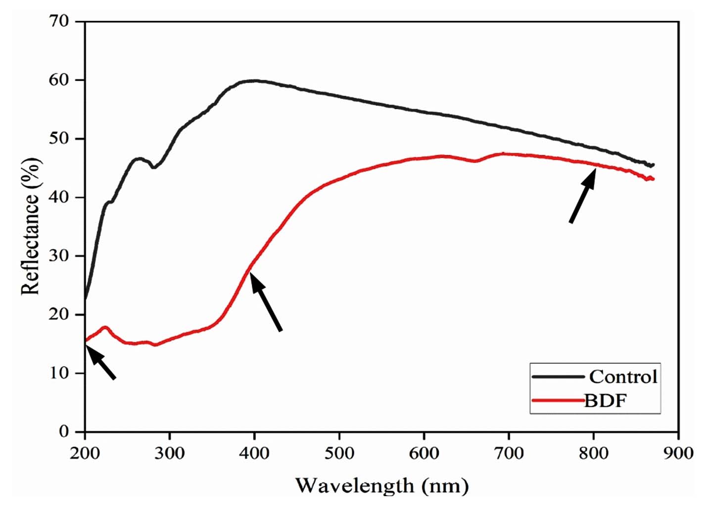 A German-made Analytik Jena UV-visible/DRS spectrophotometer (SPECORD 210 PLUS, Jena, Germany) was employed to measure the UV-visible spectra of the PVA/PEG/JSE BDF. The transparency of the sample was evaluated within the 200-900 nm wavelength range.