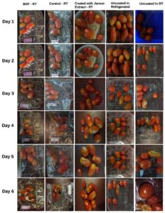 The sensory results confirm the potential of bio-composite film developed from jamun seed extract as a natural preservation material, specifically for extending the shelf life of cherry tomatoes under both ambient temperature and refrigerated conditions. The bioactive ingredients added to the packaging films lead to the preservation of the sensory and nutritional integrity of fresh fruits and vegetables, and thus, a sustainable food preservation alternative to artificial preservatives, which would reduce the issue of food waste.