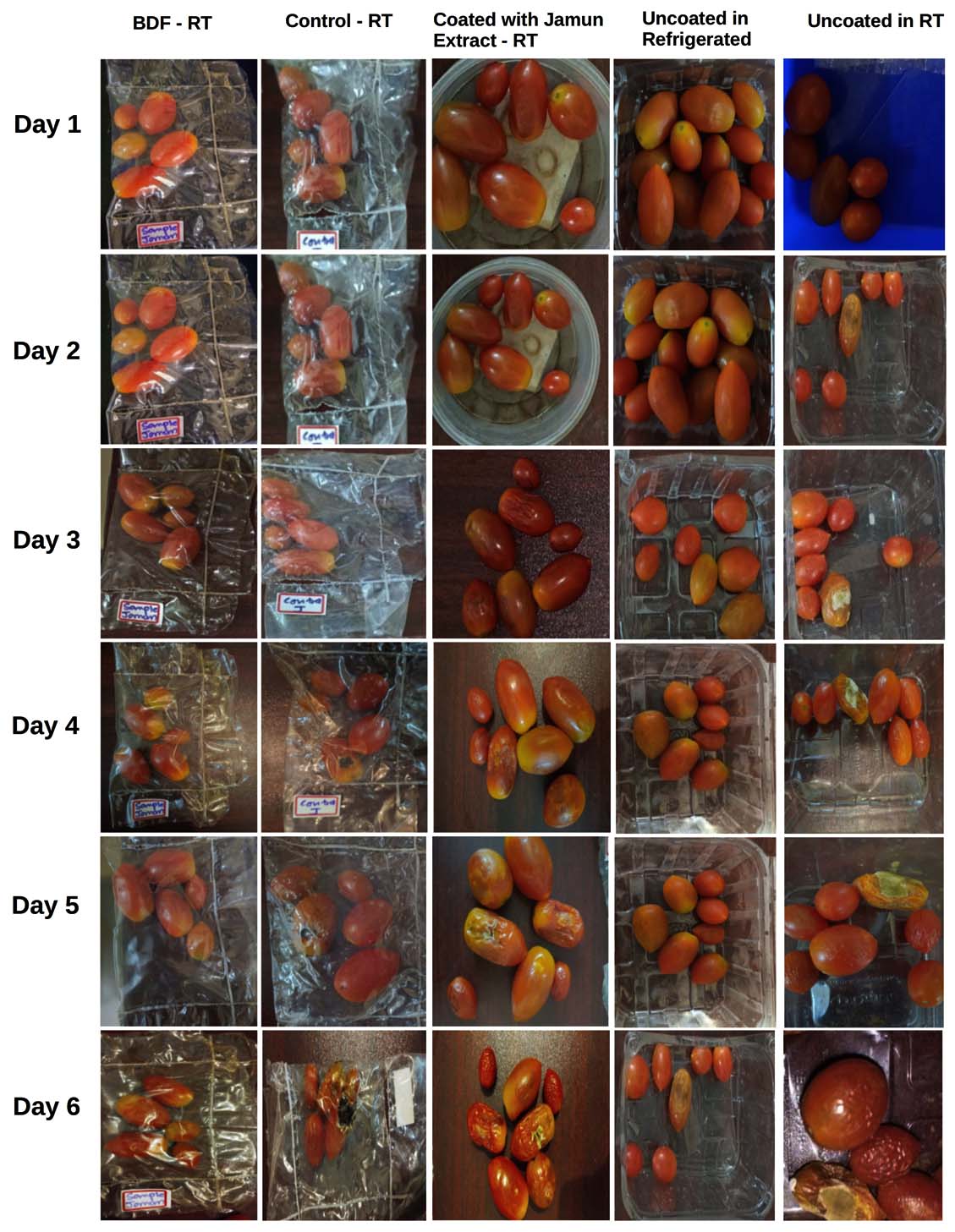 Fruit and vegetable post-harvest losses caused by water, microbial infection, and poor storage can range from 15%-50% globally reported.23 Specifically, Cherry tomatoes are rich in carotenoids and antioxidants, including vitamin C, lycopene, and polyphenols,24 and have been shown to help reduce the risk of heart disease and cancer.25 However, despite the nutritional value, cherry tomatoes are highly susceptible to postharvest pathogens, namely Rhizopus spp., Botrytis cinerea (gray mold), Alternaria alternata (black mold), Fusarium oxysporum, and Geotrichum candidum (sour rot), which significantly affect their shelf life by causing decay and spoilage, reducing the marketability and quality of tomatoes during storage and transportation.26 Because of this, the need to develop alternatives to current packaging technologies has arisen, and an attempt has been made to produce a novel jamun extract-coated biodegradable polymer to enhance the shelf life of cherry tomatoes. The main aim of this study is to develop a novel biodegradable film based on jamun seed extract specifically designed for food packaging applications. The experiment entails the assessment of the antimicrobial efficacy of the seed extract and phytochemical content of the plant extracts by means of Gas Chromatography-Mass Spectrometry (GC-MS). To develop a biodegradable film using plant-derived resources and biodegradable polymers. Evaluate the developed film’s thermal and structural characteristics using Thermogravimetric Analysis (TGA), Differential Scanning Calorimetry (DSC), UV-Diffuse Reflectance Spectroscopy (UV-DRS), X-ray Diffraction (XRD), Scanning Electron Microscopy (SEM), and Fourier Transform Infrared Spectroscopy (FTIR). To determine the biodegradability of the packaging material through appropriate testing methods. Finally, to determine the practical use of the films in food products and assess their sensory properties and shelf-life characteristics.