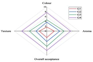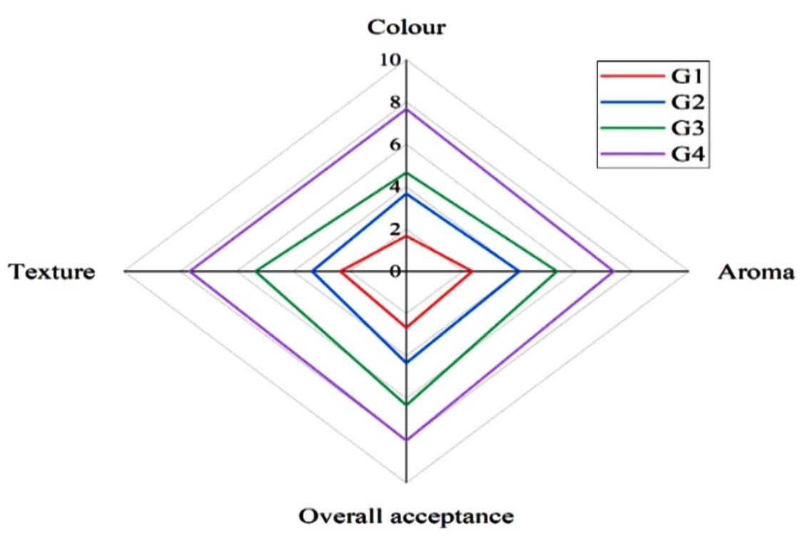 Figure 14. The sensory parameters of the stored cherry tomatoes were rated on the final day of storage, where colour, aroma, texture, and overall acceptance were recorded for all four groups (G1, G2, G3, G4)