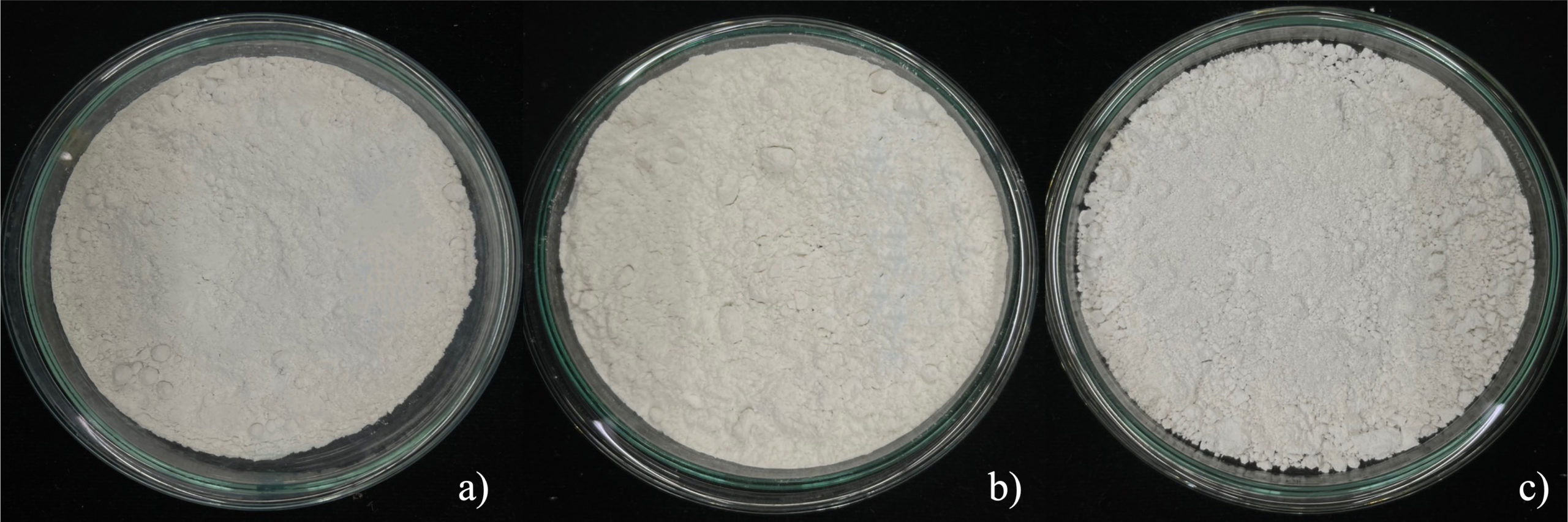 Figure 1. Powdered formulations of Bacillus velezensis MSU01: (a) talcum-based, (b) corn starch-based, and (c) kaolin-based formulations