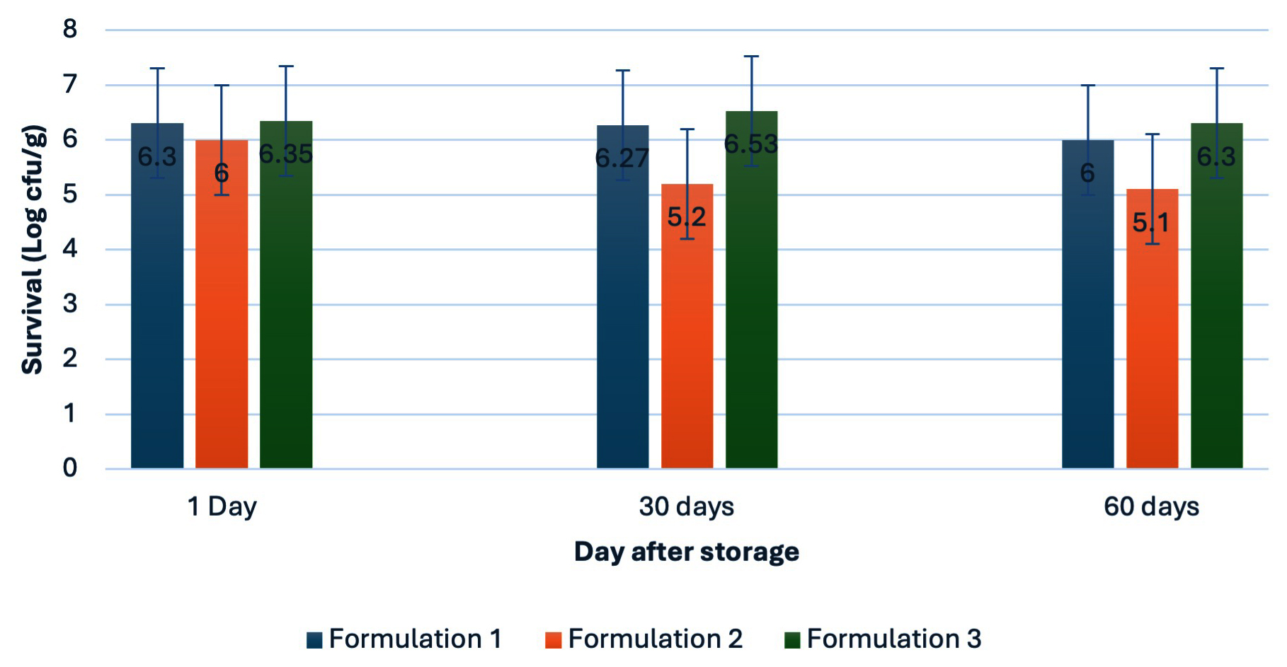 The survival of B. velezensis MSU01 in the three powdered formulations was assessed during a 60-day storage period at room temperature (Figure 2). At day 1, all formulations exhibited high viable counts, ranging from 6.00 to 6.35 log CFU/g. After 30 days, the kaolin-based formulation (Formula 3) showed the highest viable count (6.53 ± 0.20 log CFU/g), followed by the talcum-based (Formula 1) and corn starch-based (Formula 2) formulations. By day 60, the kaolin-based formulation maintained the highest survival (6.30 ± 0.30 log CFU/g), while the corn starch-based formulation exhibited the lowest viable count (5.10 ± 0.85 log CFU/g).