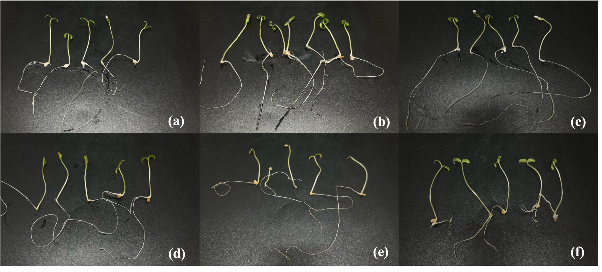 Seed germination was recorded on days 5 and 14 after treatment. At day 14, tomato seedlings were carefully removed, and both stem height and root length were measured. Stem height was determined by measuring from the root–shoot junction to the shoot tip, and root length was measured from the root base to the tip of the longest root. Measurements were taken from all seedlings in each treatment group.