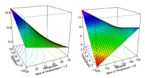 where Y is the response variable, β0 the constant, β1, β2, β3 were the coefficients for the linear, quadratic, and for the interaction effects, respectively, and Xi and Xj the coded level of variables xi and xj. Surfaces for all variables were plotted using the quadratic equation shown above.