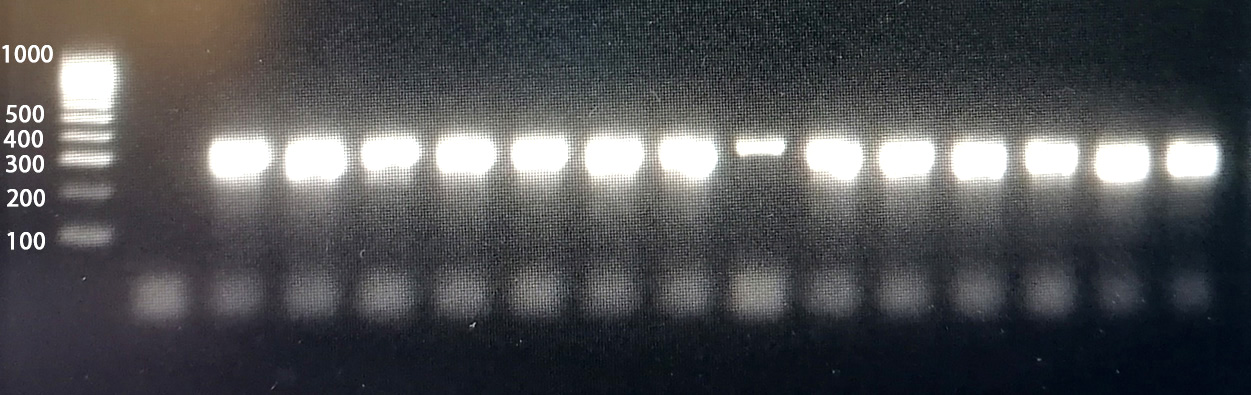 Figure 2. Gel electrophoresis (2.0% agarose) of the amplified cfb gene from 14 CAMP-negative isolates. Molecular weight marker 100-1000 bp DNA Ladder (Meridian Bioscience, USA) was used, followed by one negative control and positive results for cfb gene of tested isolates
