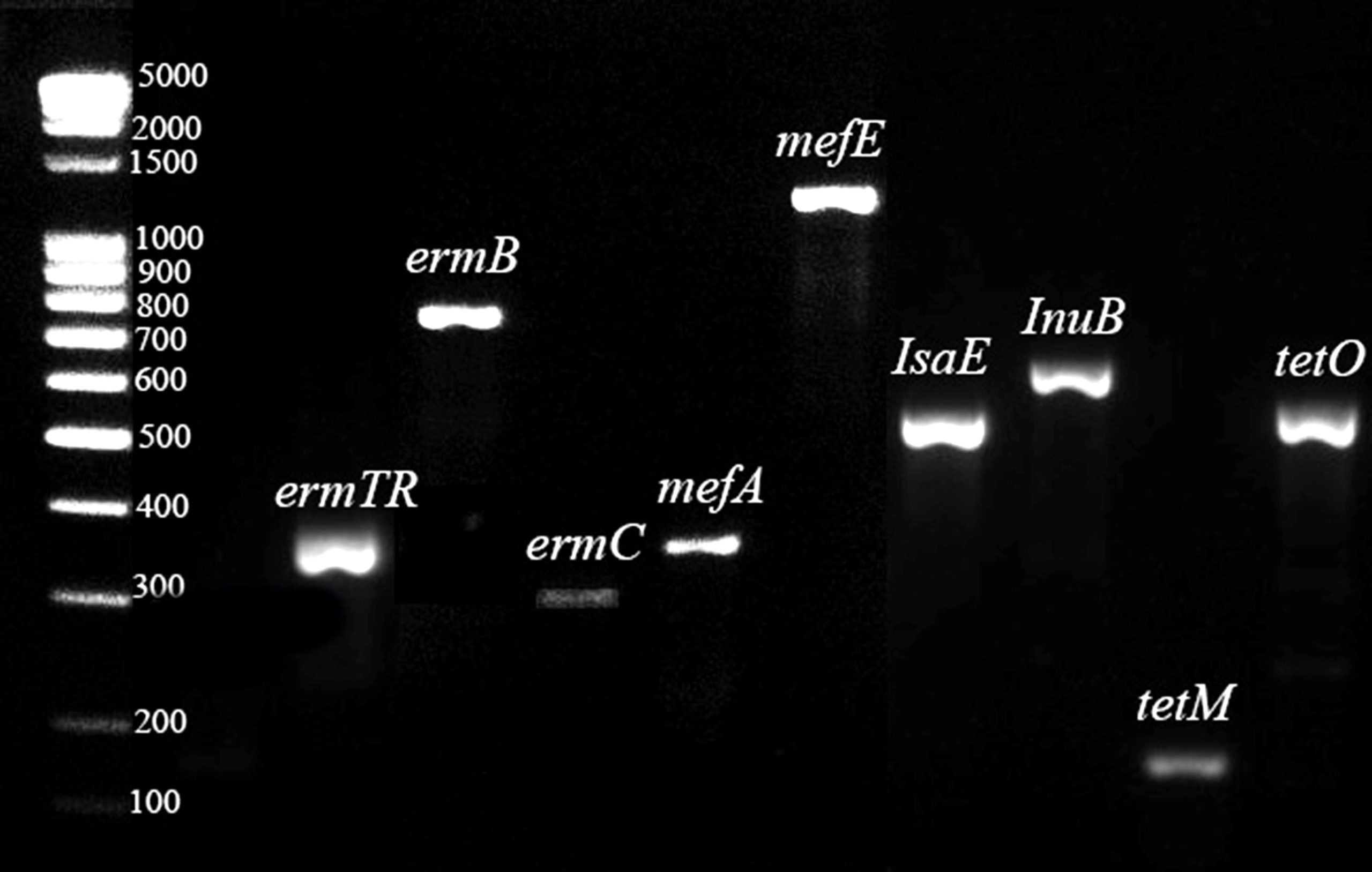 Figure 3. Gel electrophoresis (2.0% agarose) of the amplified gene determinants for the identification of macrolide, lincosamide, and tetracycline resistance. Molecular weight marker 100-5000 bp DNA Ladder Extended (Carl Roth GmbH, Germany) was used