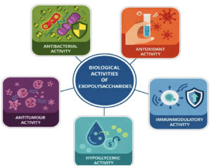 A comprehensive summary of the reported biological activities of bacterial exopolysaccharides along with their sources is provided in Table 1, and an overall schematic representation of the structure–activity relationship and associated biological roles is illustrated in Figure 1.